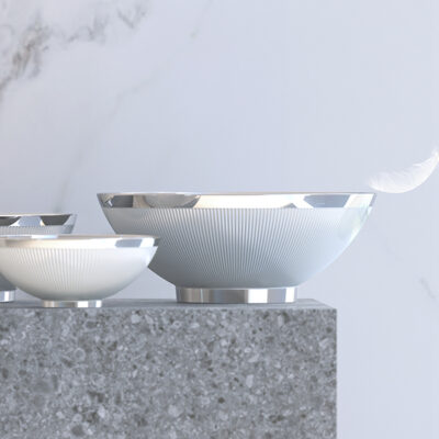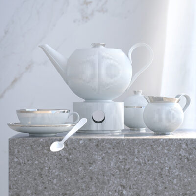 Decorated with filigree structures, inspired by the radiance of a shining star. Available in three designs, white glazed, satin white and white glazed with Platinum rim