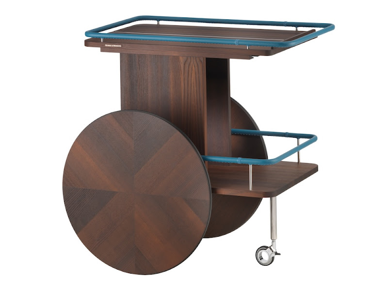 | Bar trolley, wheels and body are made of Thermo Ash (FSC certified, oiled) The railing is made of stainless steel covered with nappa leather in either Beige or Ocean Blue