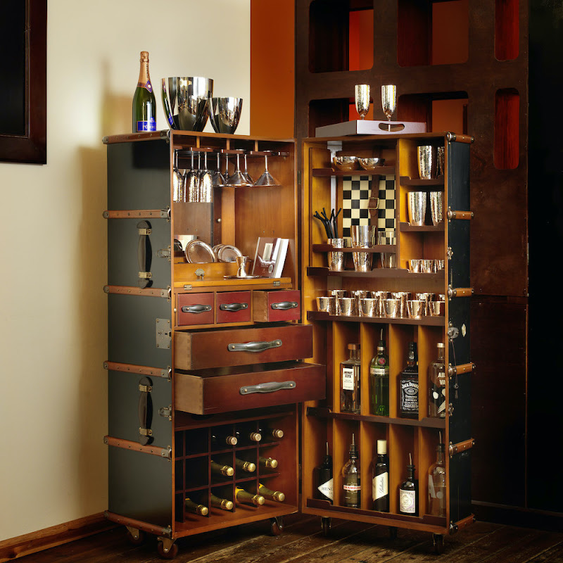| Bar trolley, wheels and body are made of Thermo Ash (FSC certified, oiled) The railing is made of stainless steel covered with nappa leather in either Beige or Ocean Blue