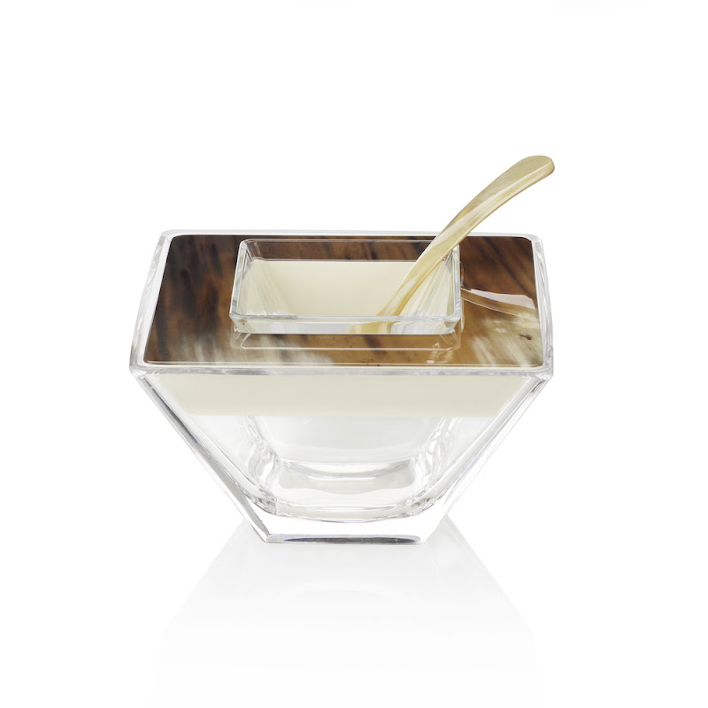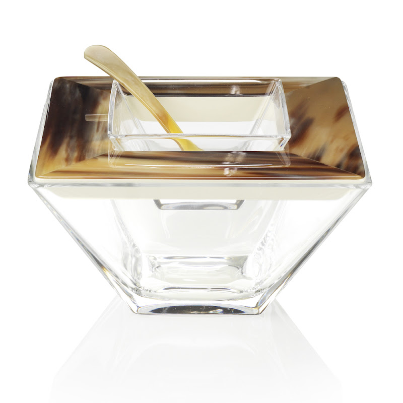 Caviar bowl in horn, wood with ivory lacquered gloss finish and Venetian glass. Caviar spoon in horn.