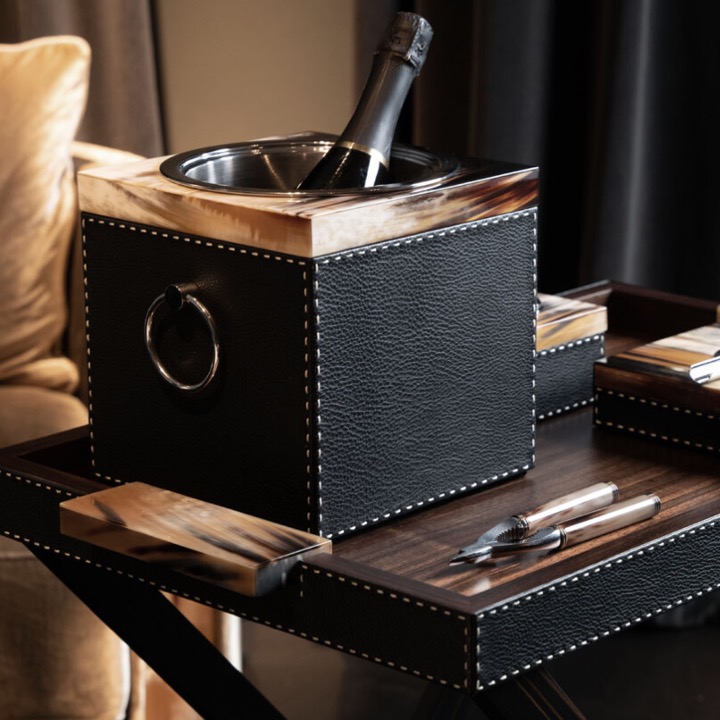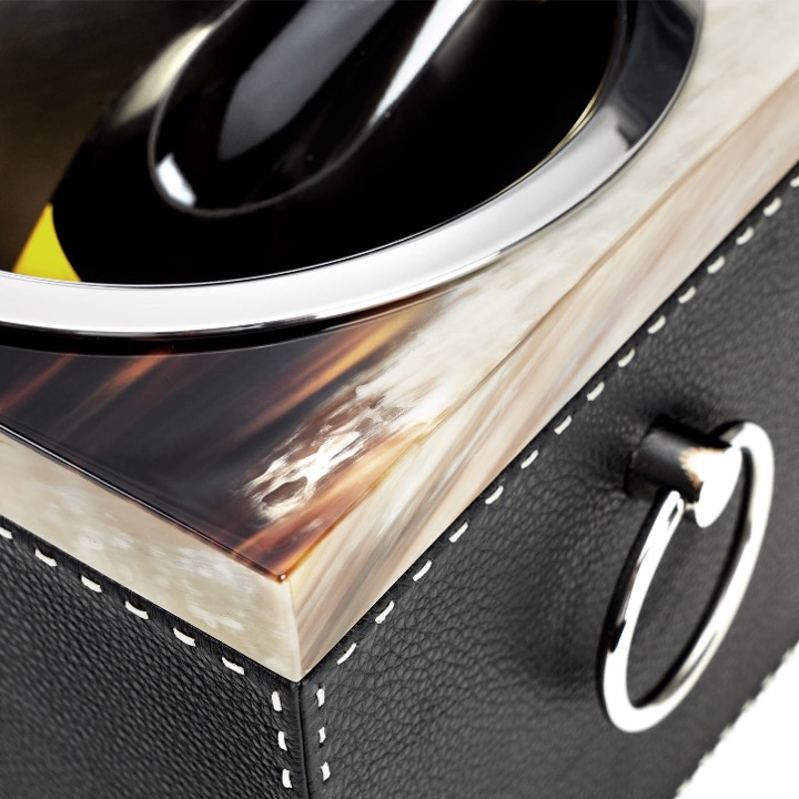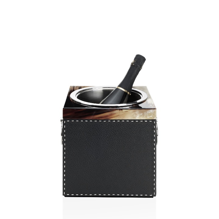 Glossy horn and Aida pebbled leather, Onyx colour with handmade ivory stitching. The removable bucket liner and handles are in stainless steel.