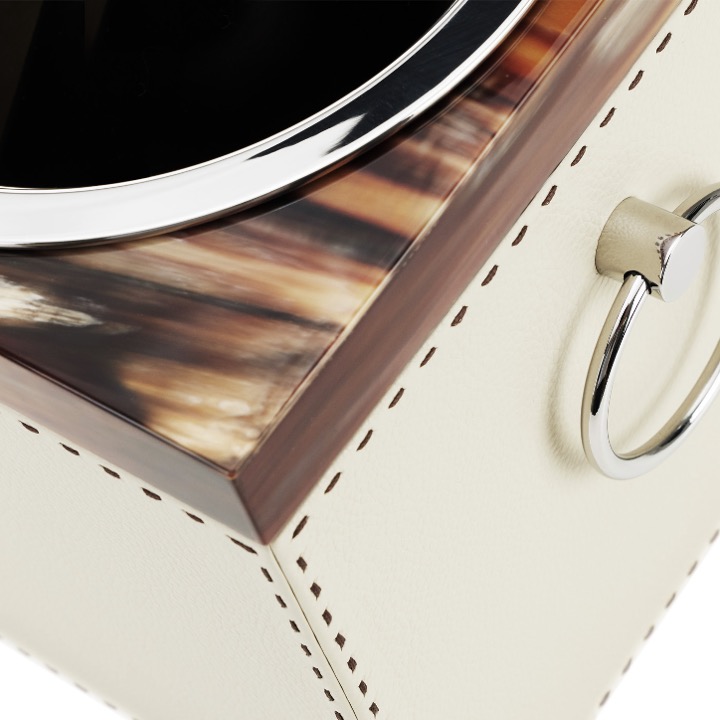 Glossy horn and Aida pebbled leather, Ice-cream colour with handmade dark brown stitching.