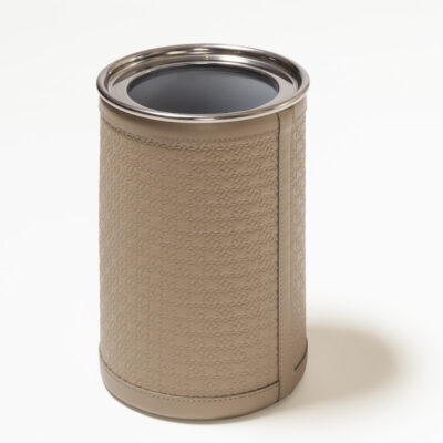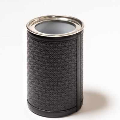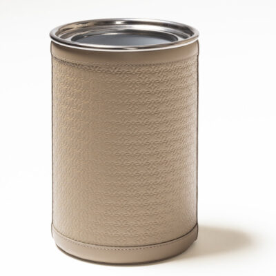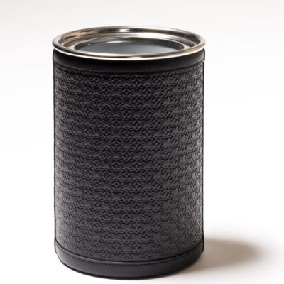 Stainless steel thermic bottle cooler covered with leather featuring the ELIE SAAB monogram pattern on two sides.