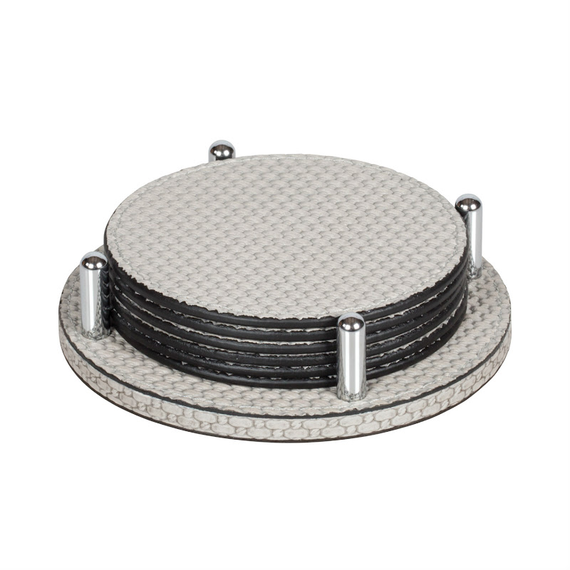 Coaster holder with 6 coasters, round "David". Leather covered wood structure able to host 6 "Tao" coasters. Coasters made entirely of leather, semi-flexible and waterproof.
