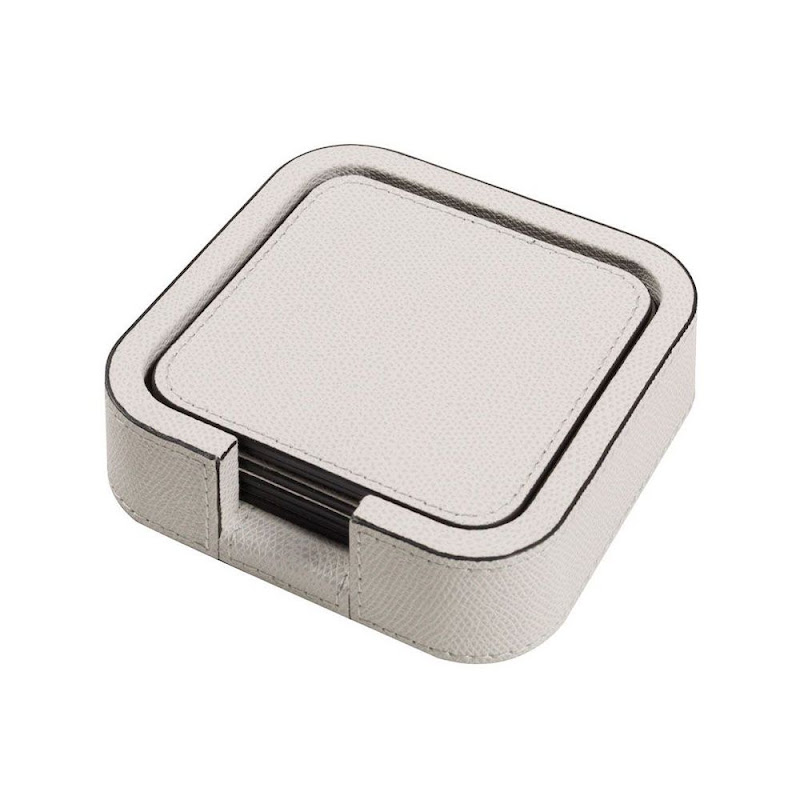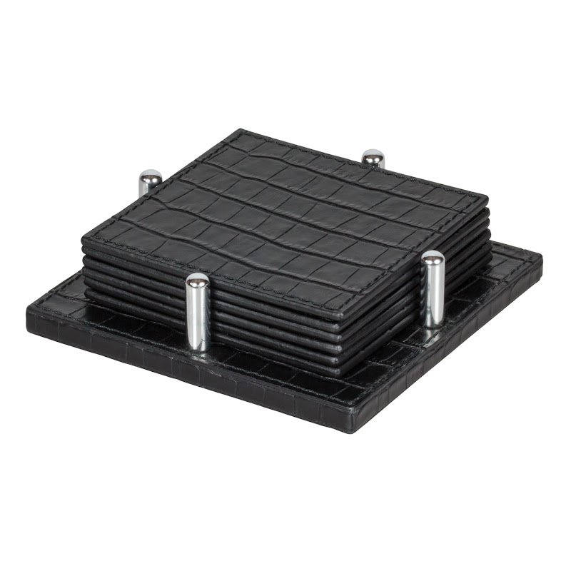 | Coaster holder with 6 coasters, square “Tao”. Wood structure covered in calf leather. Coasters made entirely of leather, semi-flexible and waterproof.