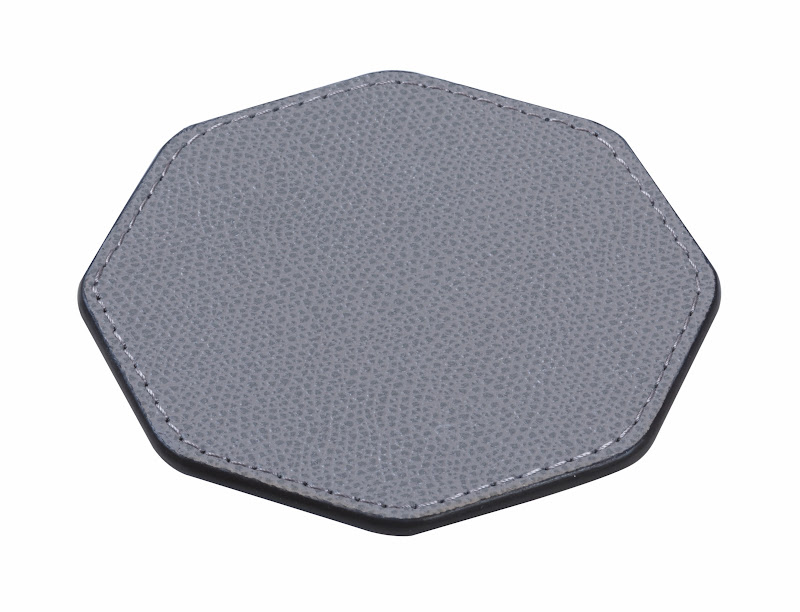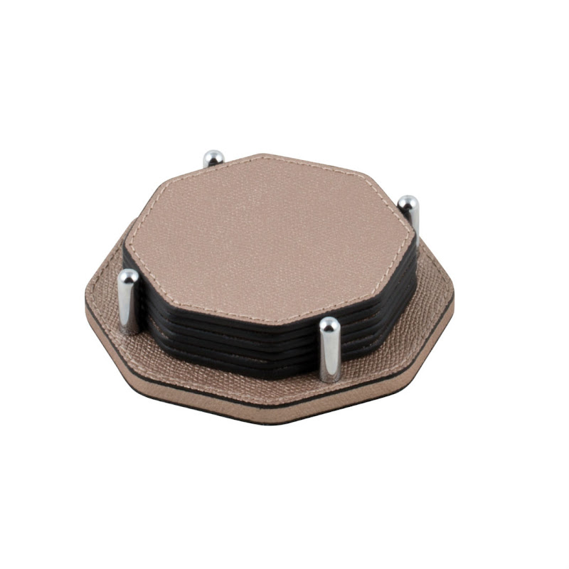 | Coaster holder with 6 coasters, octagonal “David”. Leather covered wood structure able to host 6 “Tao” coasters. Coasters made entirely of leather, semi-flexible and waterproof.