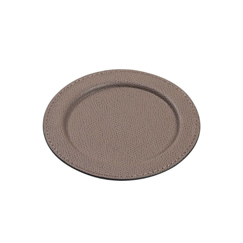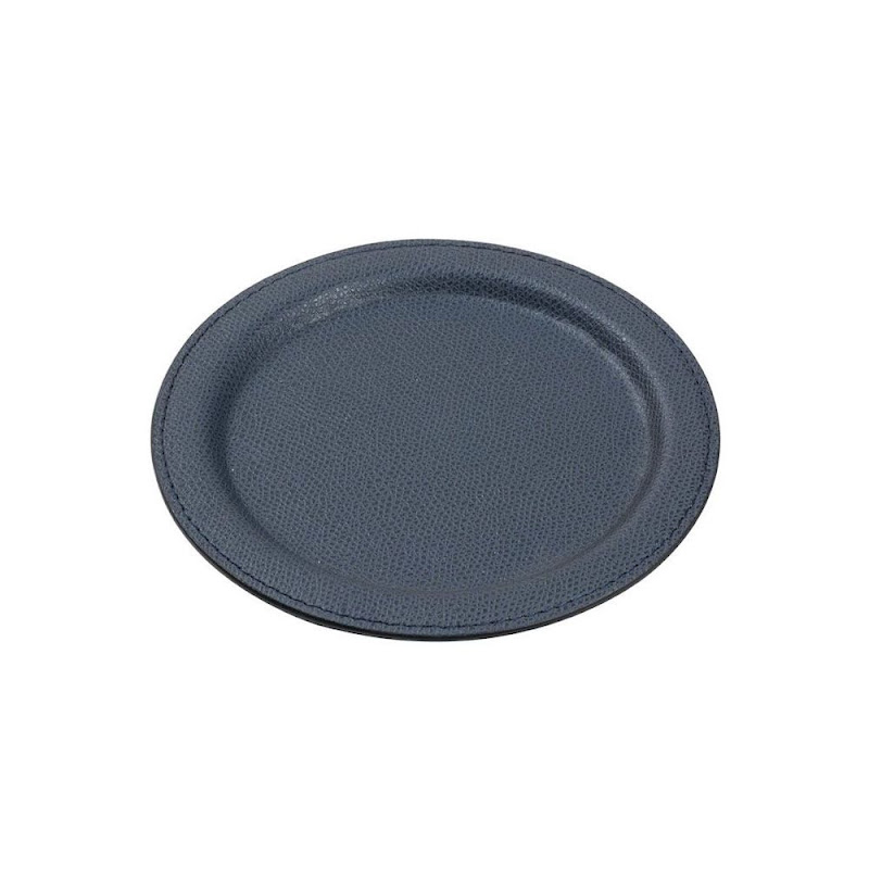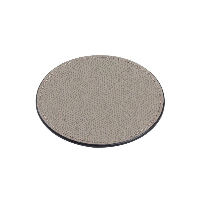 | Coaster holder with 6 coasters, round “Tao”. Wood structure covered in calf leather. Coasters made entirely of leather, semi-flexible and waterproof.