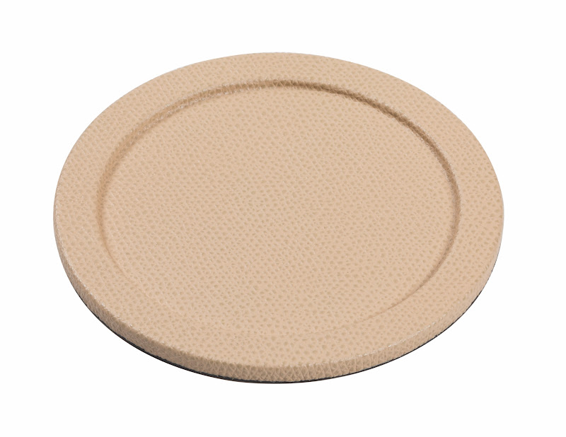 | Coaster holder with 6 coasters, round “David”. Leather covered wood structure able to host 6 “Tao” coasters. Coasters made entirely of leather, semi-flexible and waterproof.