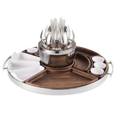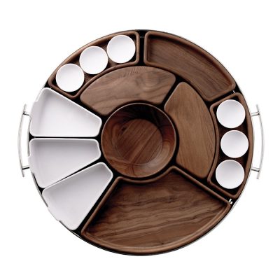 The tray features a wooden center part that can hold the 'Mood Asia' cutlery set, 1 large rounded wooden board, 5 small rounded wooden boards, 3 large white porcelain compartments and 6 white porcelain sauce bowls. ( Ø60mm - 4cl. )