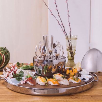 Stainless steel tray with walnut wood and Limoges porcelain inlays for serving Asian food, like Sushi, Maki, Tempura, Dim Sum