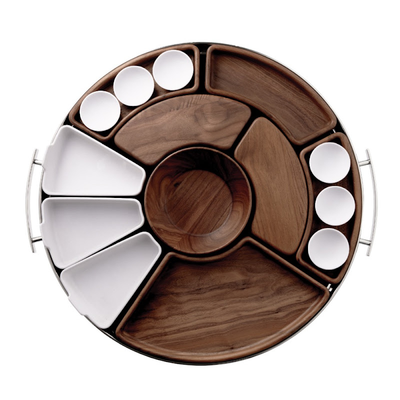 Stainless steel tray with walnut wood and Limoges porcelain inlays for serving Asian food, like Sushi, Maki, Tempura, Dim Sum