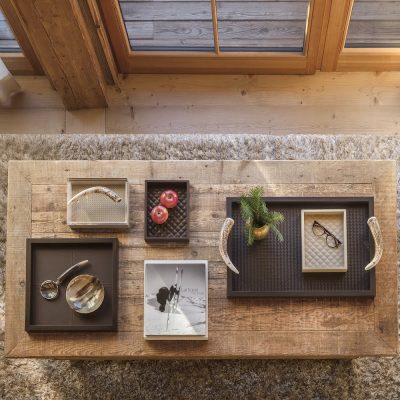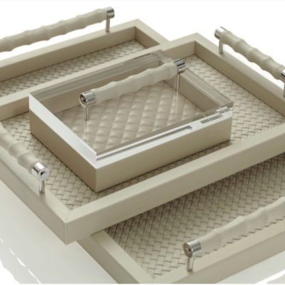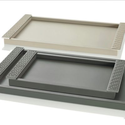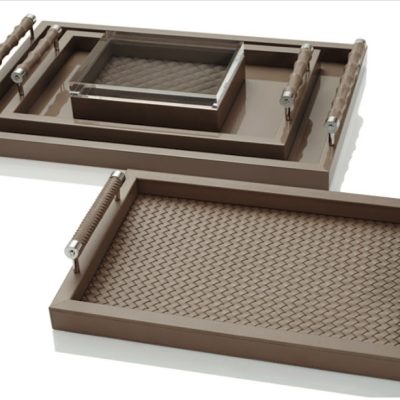 A wide collection of trays made of calf leather and/or laquered wood. Some trays have chrome plated or gold plated details and handles made of horn or bamboo