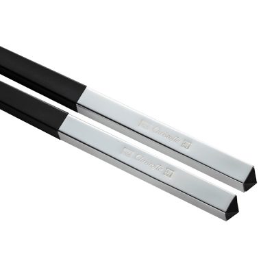 This set contains a pair of Black UNI Chinese chopsticks made of resin with silver-plated finishes and a silver-plated chopsticks rest from the Vertigo collection.