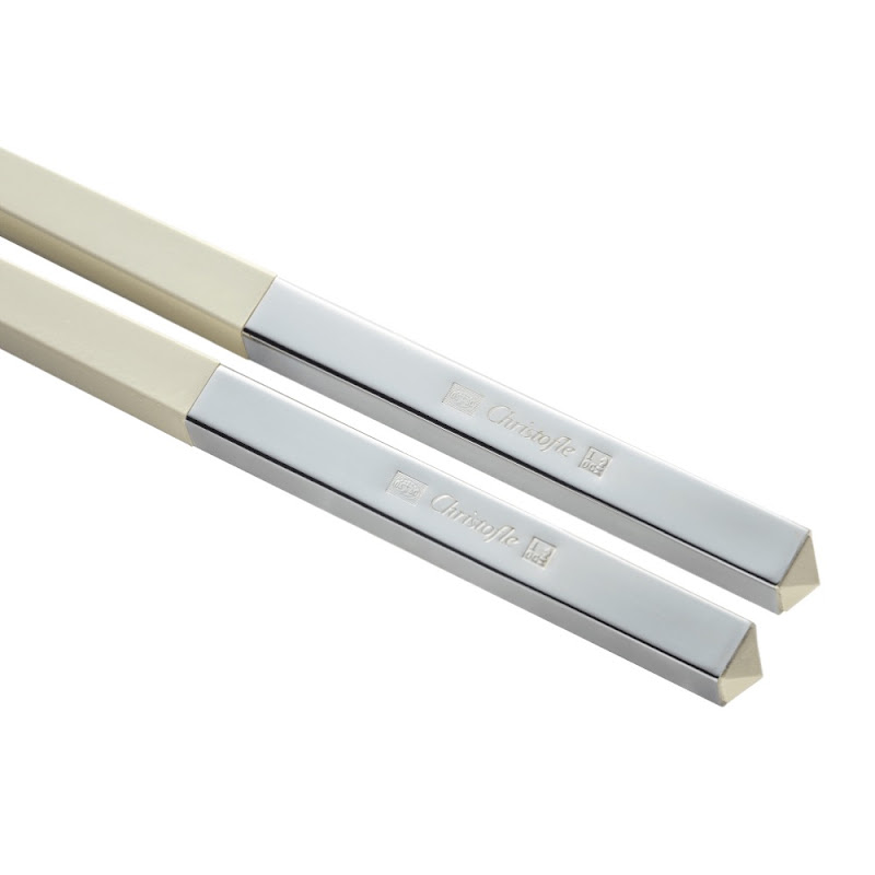 This set contains a pair of White UNI Chinese chopsticks made of resin with silver-plated finishes and a silver-plated chopsticks rest from the Vertigo collection.