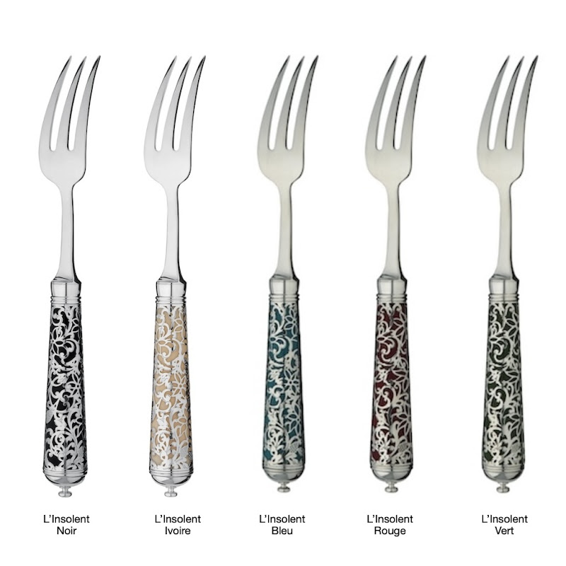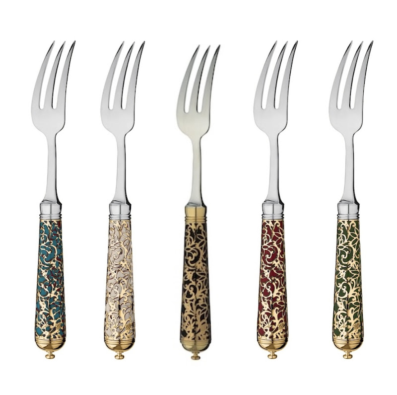 The bright coloured handles of this model are adorned with a guilded silver filigree overlay, featuring elegant arabesques