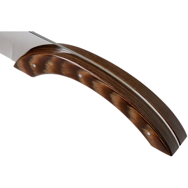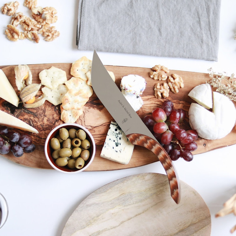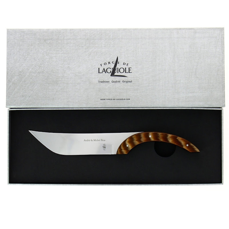 Its tapered and beveled cutting edge results in a high precision cut. The shape of the handle ensures that the knife is perfectly balanced when posed on the table without the blade touching the surface.