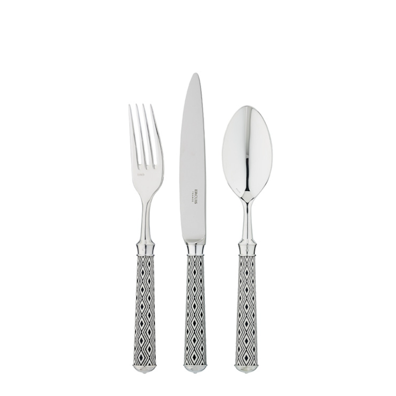 With it’s coloured patterns evoking the key trends of French Decorative Arts.The flatware is lacquered before being engraved with one of the 10 guilloché patterns. It is then silver or gold plated