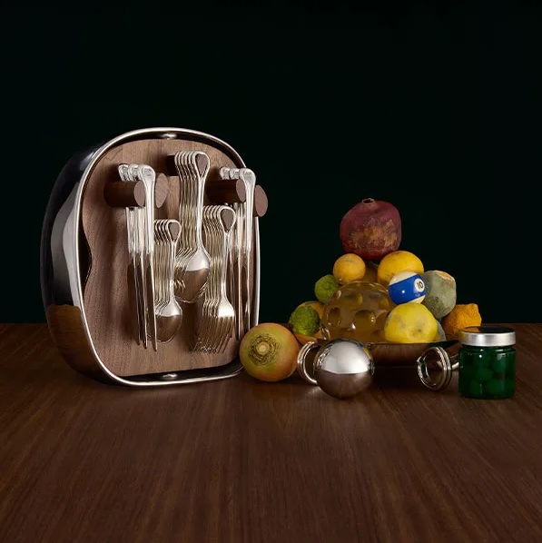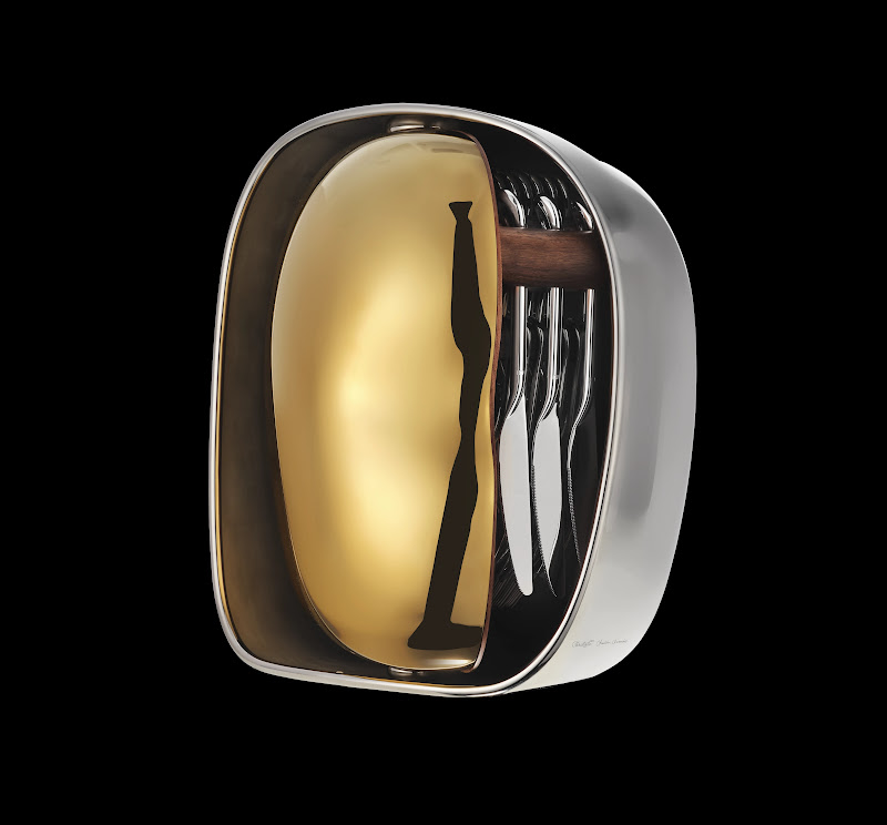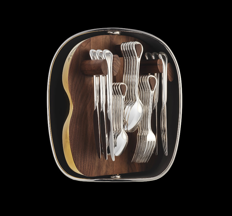 The interior reveals a walnut tableau that holds the full silver-plated set (6 dinner forks, 6 dinner knifes, 6 table spoons and 6 dessert spoons) stored upright along an ingenious system of pegs, inspired by the planar forms of Jean Arp.