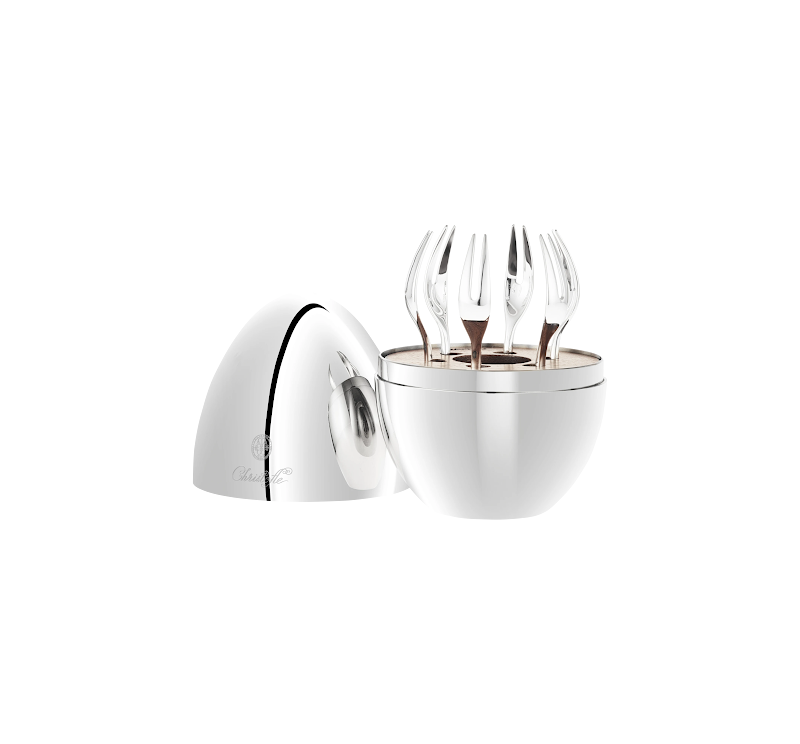 Set of 6 small silver-plated cocktail forks in mirror-polished steel case designed to ensure the pieces are perfectly secured in place.