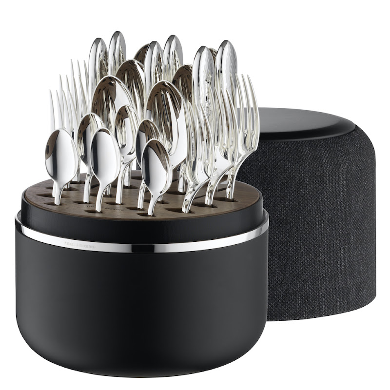 Elegant and easy Box for presenting and storing Your 24 piece cutlery set. Designed for Martelé, Riva, Belvedere, Alta, Arcade, Art Deco, Alt Chippendale, Alt Spaten, Avenue, Dante , Eclipse, Rosenmuster in Sterling Silver, silverplated and in Frozen Black in de modellen: Martelé, Riva en Belvedere. The Box is made to hold: