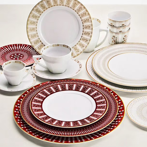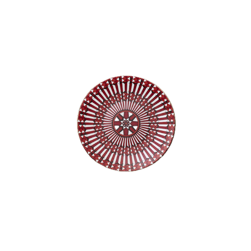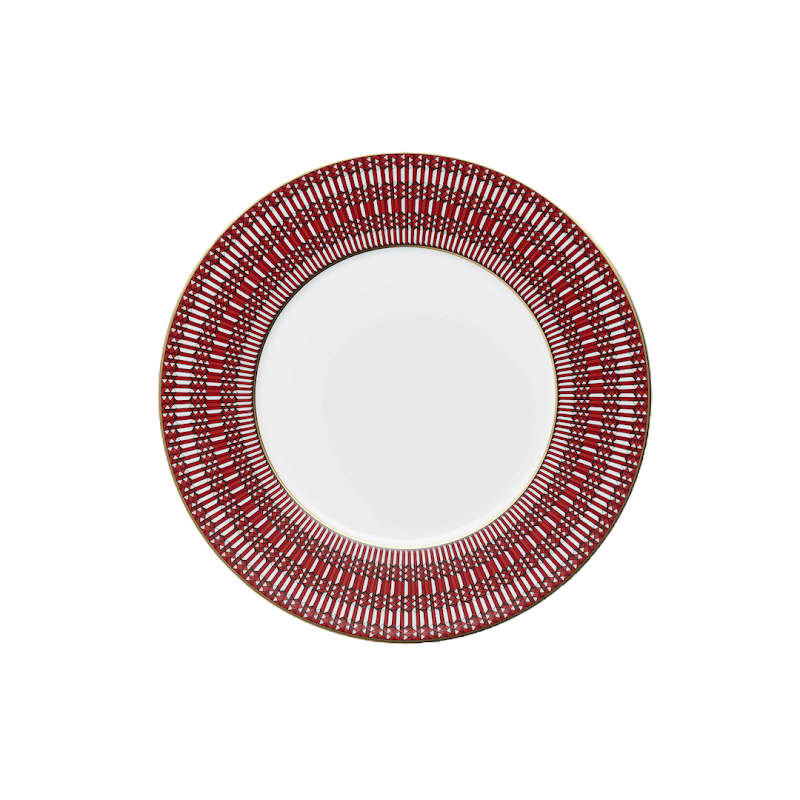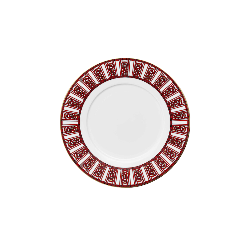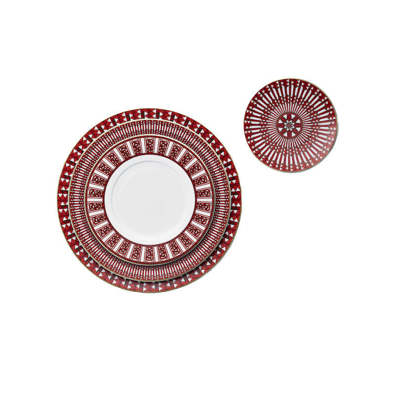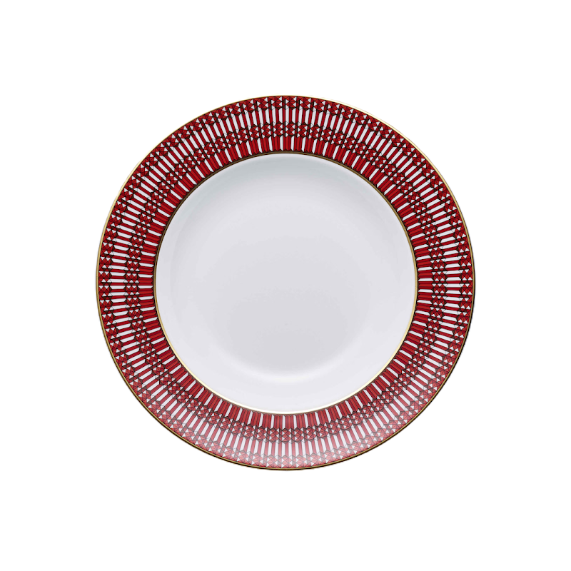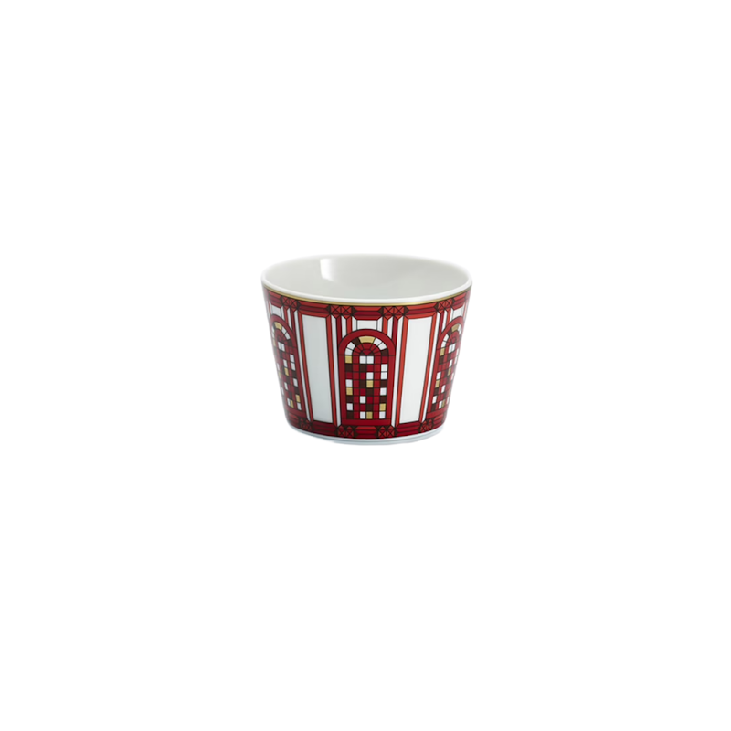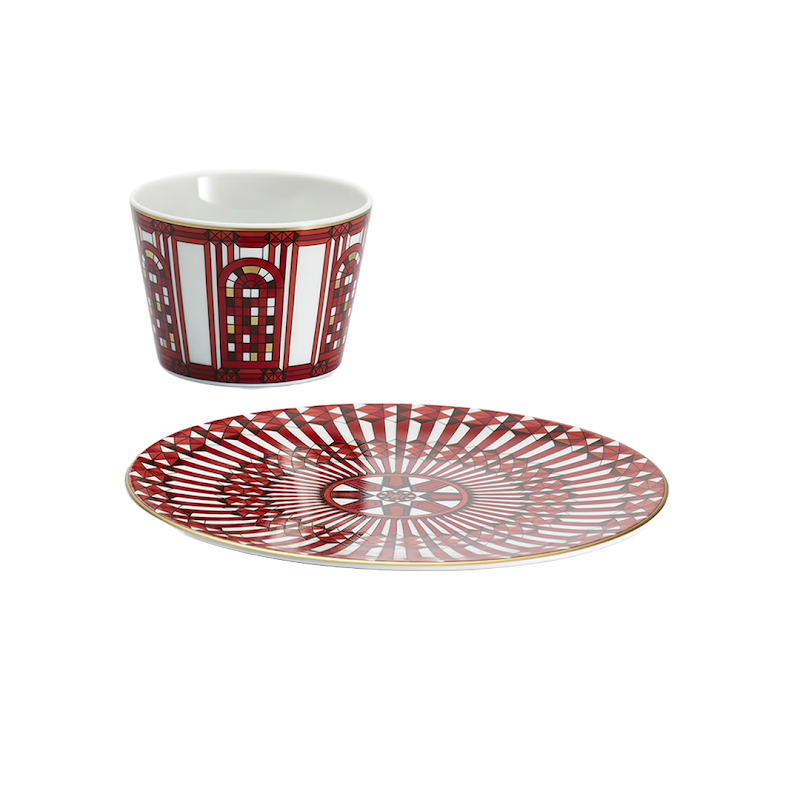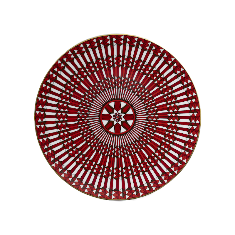Arcadia, the pattern inspired by the arched windows of Baccarat’s Manufacture, applies a kaleidoscope of graphic lines, geometric shapes, and vibrant colors. Available in red and beige.