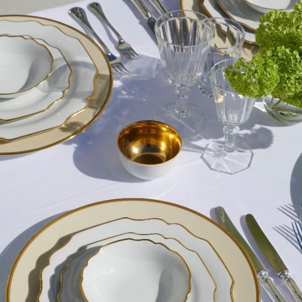 The curved silhouette has been one of the most popular and decorative forms of Viennese porcelain since 1725. The elegant gold rim enhances the unique shape and can be stylishly combined with other dinnerware.