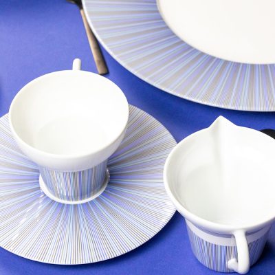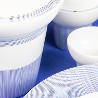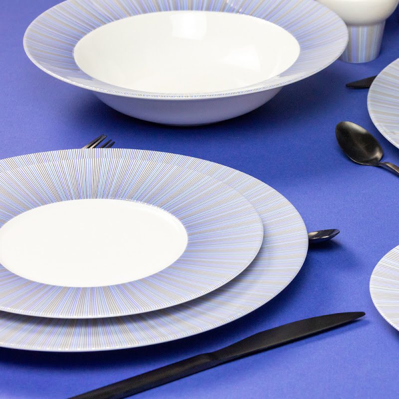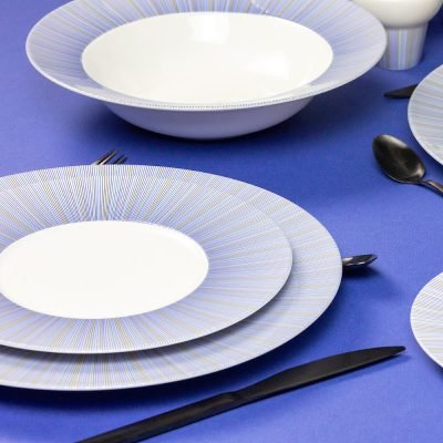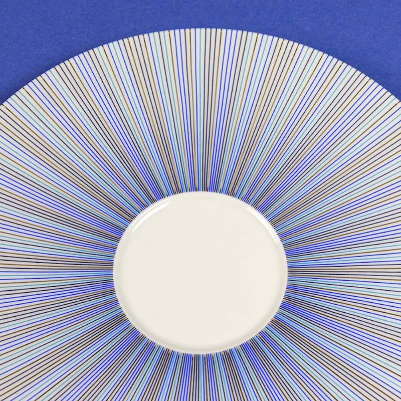 The Trompe L'Oeil lines of this pattern create the illusion of infinite blue water. This set is suitable for the dishwasher and for the microwave