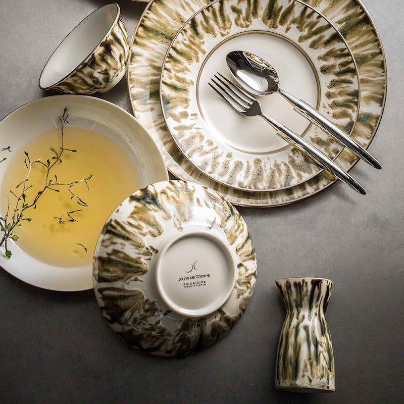 Jaune de Chrome is known world-wide for their exclusive glaze craftsmanship: Metallic components blended with glaze are meticulously applied on porcelain, after which the magic of the firing process transfoms the raw materials. Each piece is unique, neither exactly the same, nor really different.