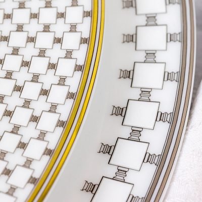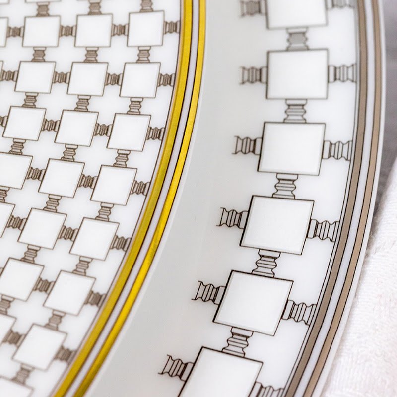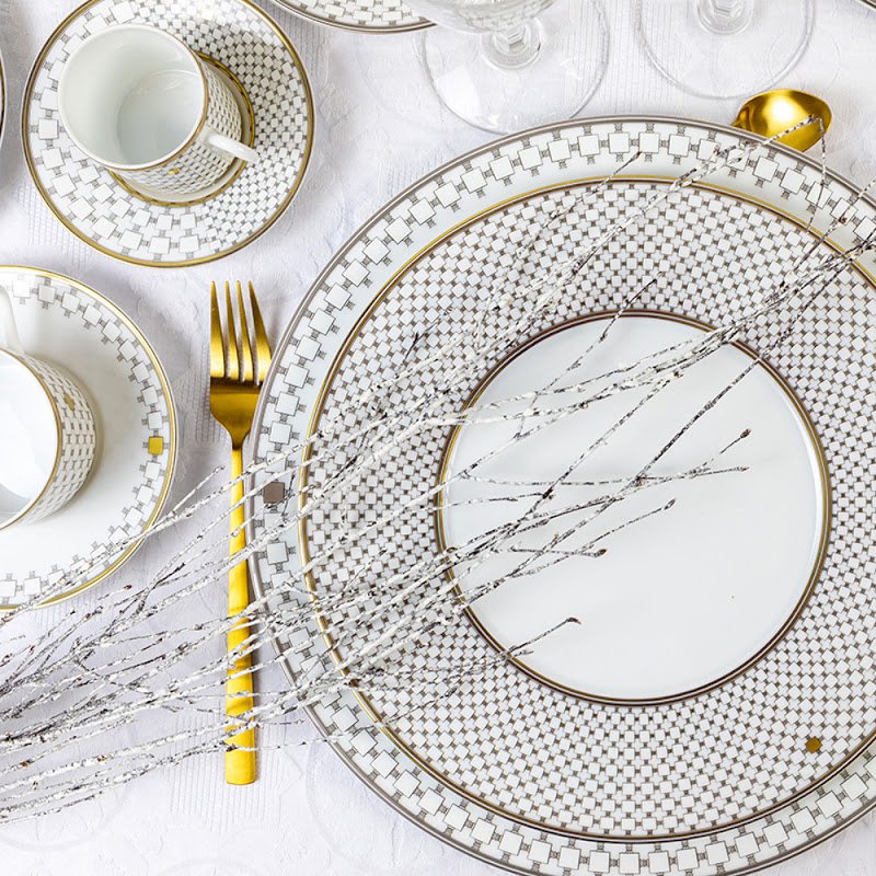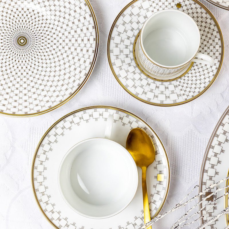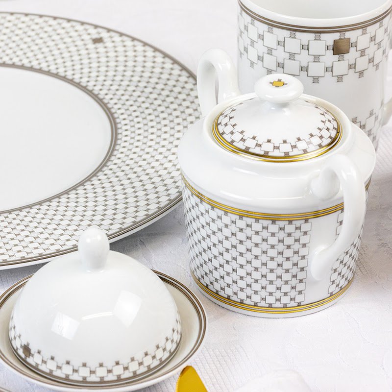 A geometrical pattern available with a gold or platinum finish. This set is not suitable for the dishwasher nor for the microwave