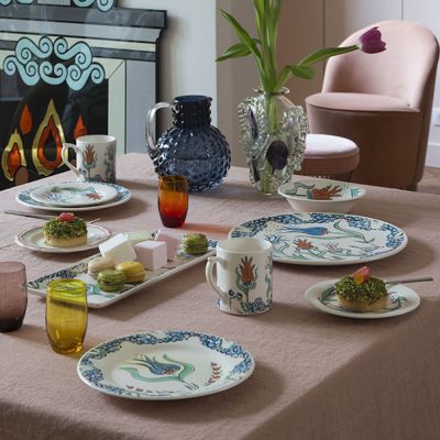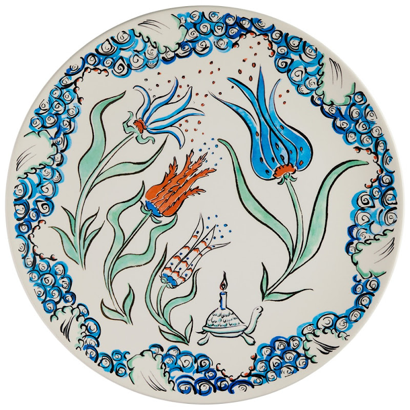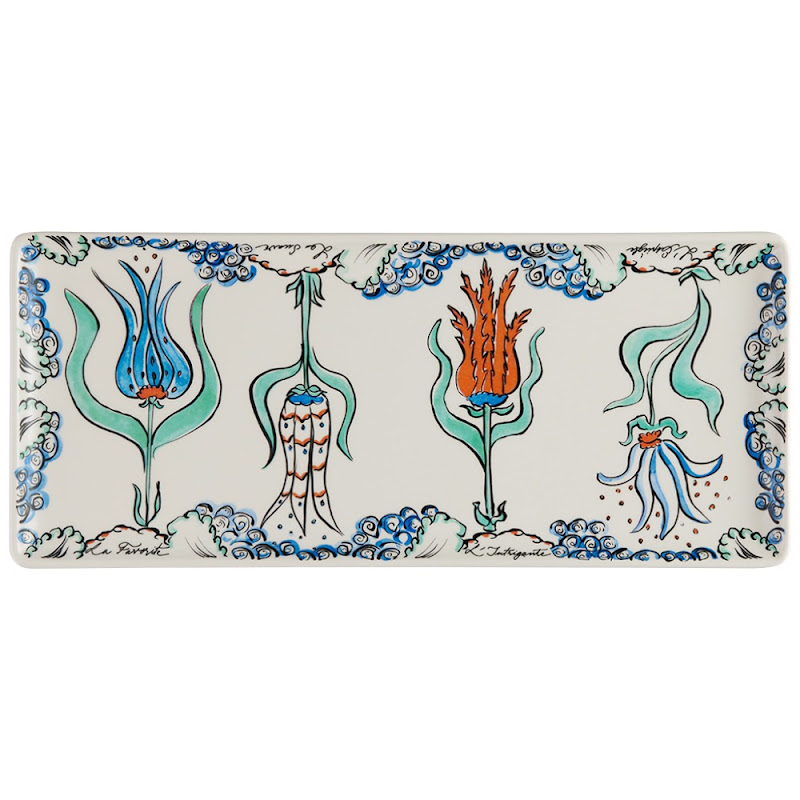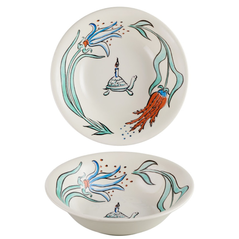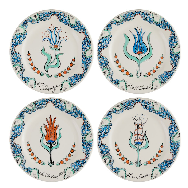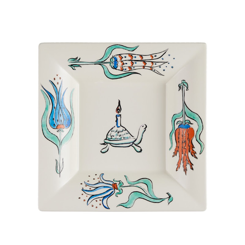 The pieces of this set form the palace flower gardens, where the turtle can be seen among tulips, bringing them light. There are four flowers, each one depicted on a dessert plate and given a name : mischievous, artful, gracious and Favorite. The turtle falls in love with this last one. On the cake plate, whilst the three other tulips try to enamour the turtle with their charms, he only has eyes for the Favorite.