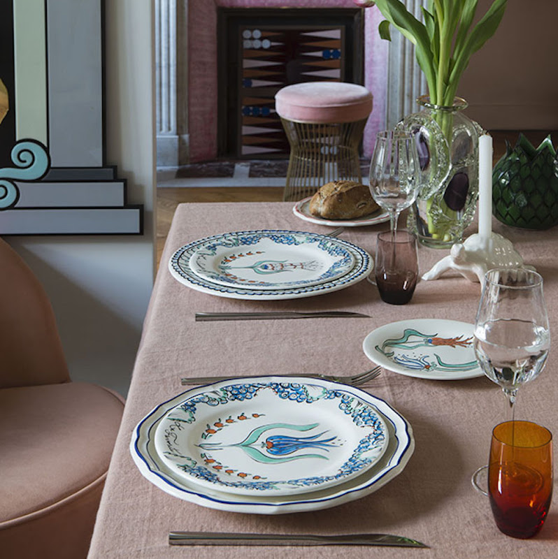 The pieces of this set form the palace flower gardens, where the turtle can be seen among tulips, bringing them light. There are four flowers, each one depicted on a dessert plate and given a name : mischievous, artful, gracious and Favorite. The turtle falls in love with this last one. On the cake plate, whilst the three other tulips try to enamour the turtle with their charms, he only has eyes for the Favorite.