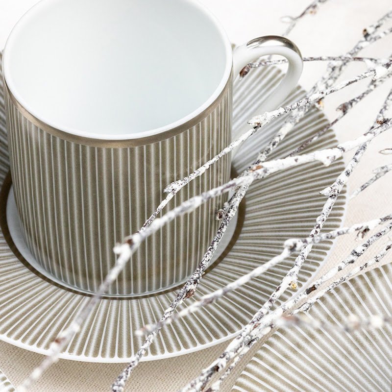 A contemporary design with refined lines in shades of browm and a platinum finish. This set is not suitable for the dishwasher nor for the microwave