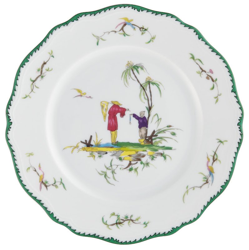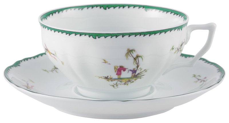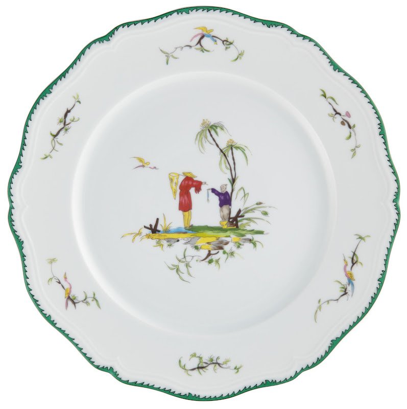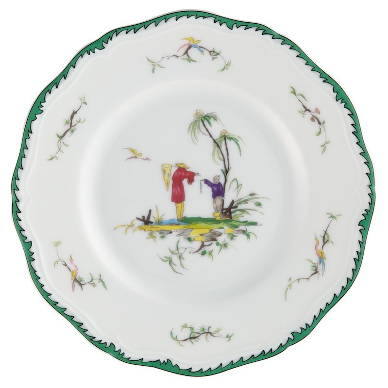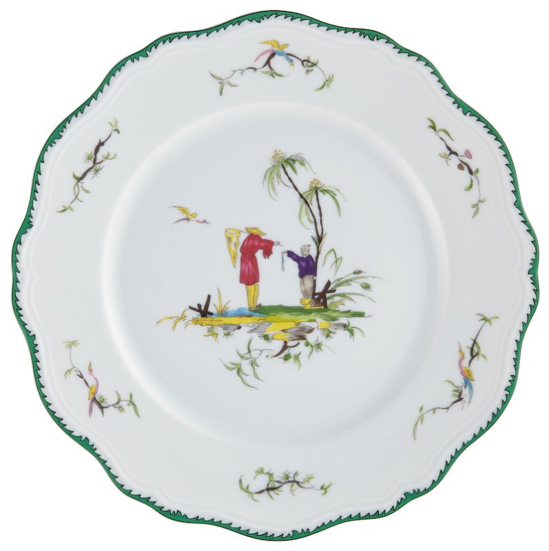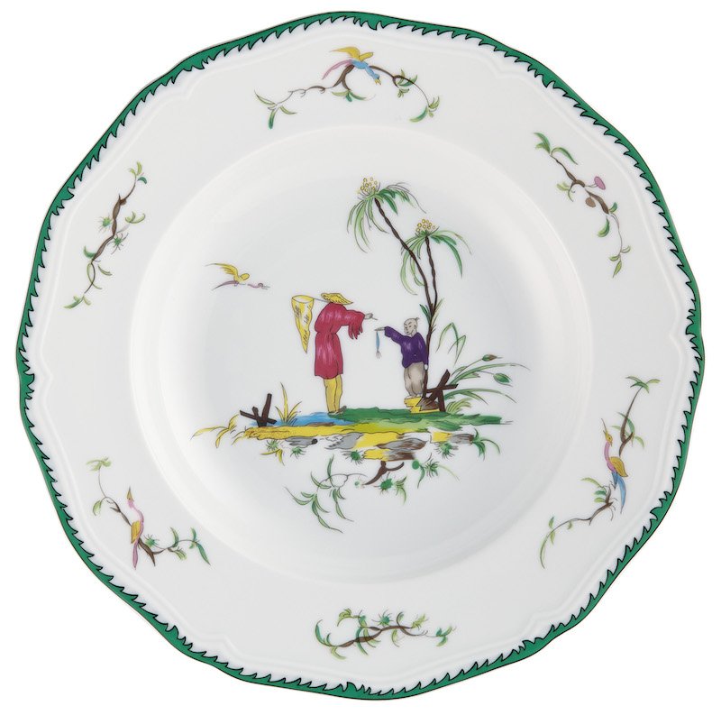 This service features six original pastoral scenes ( see overview ), available on all plates and cups, depicting fishermen in an exotic setting. The rims of the plates are decorated with foliage and birds and an elegant green trim. A perfect combination with "Touraine Double Green Band' is possible if you don't want a decoration on all items