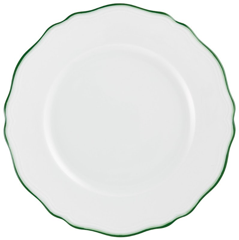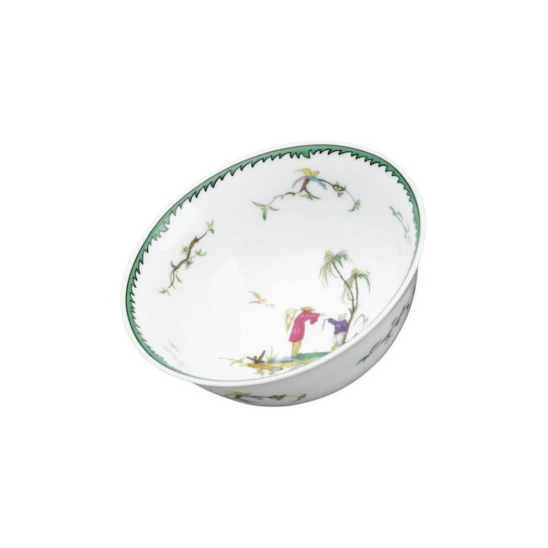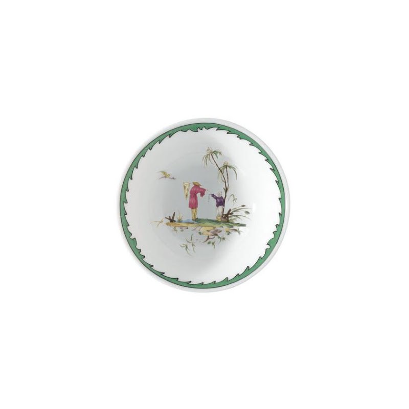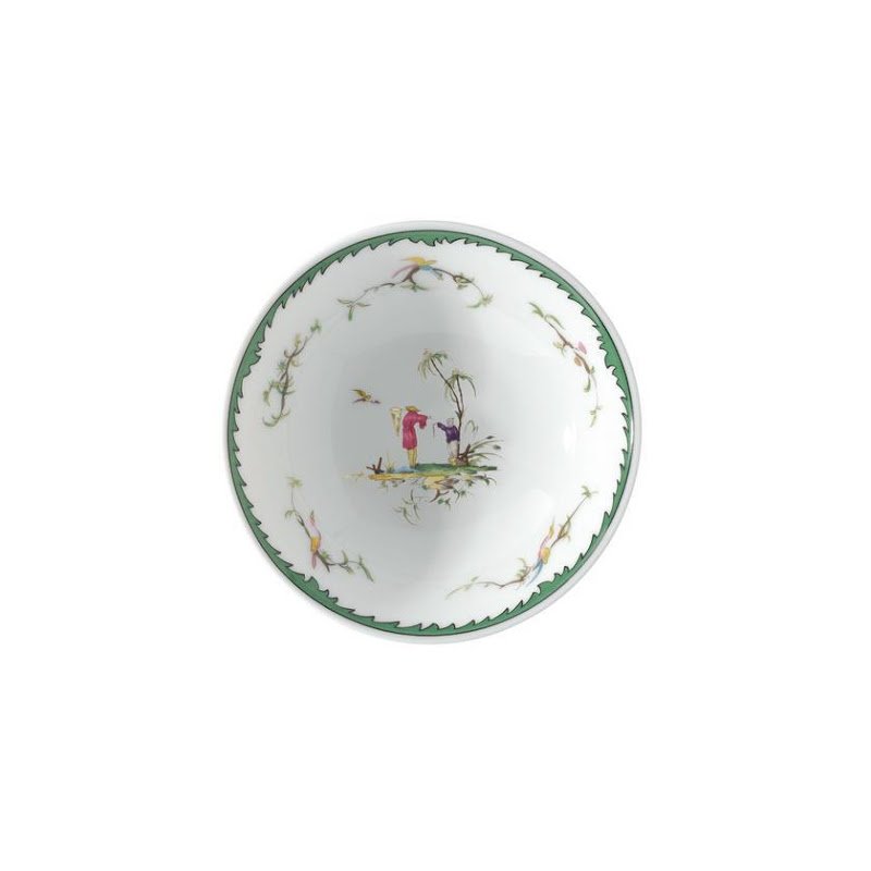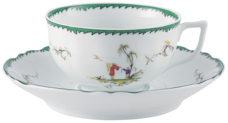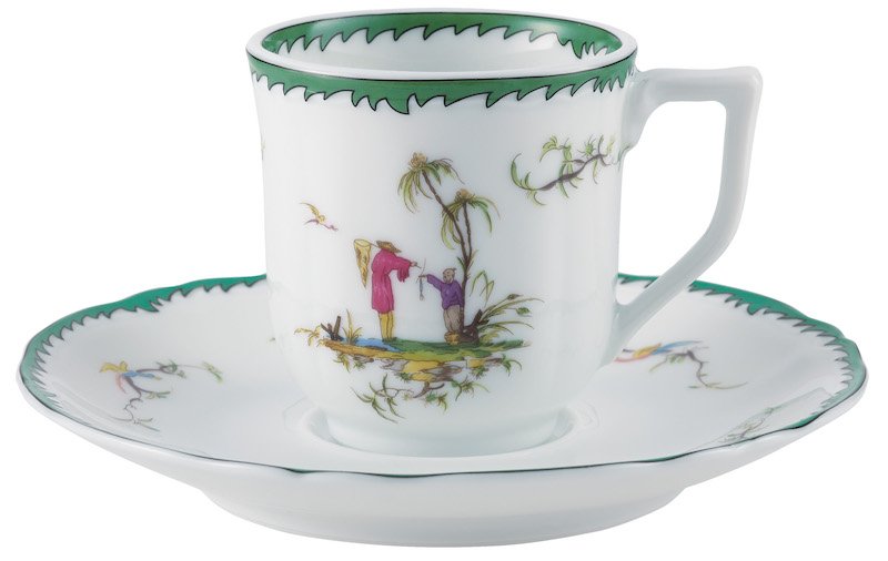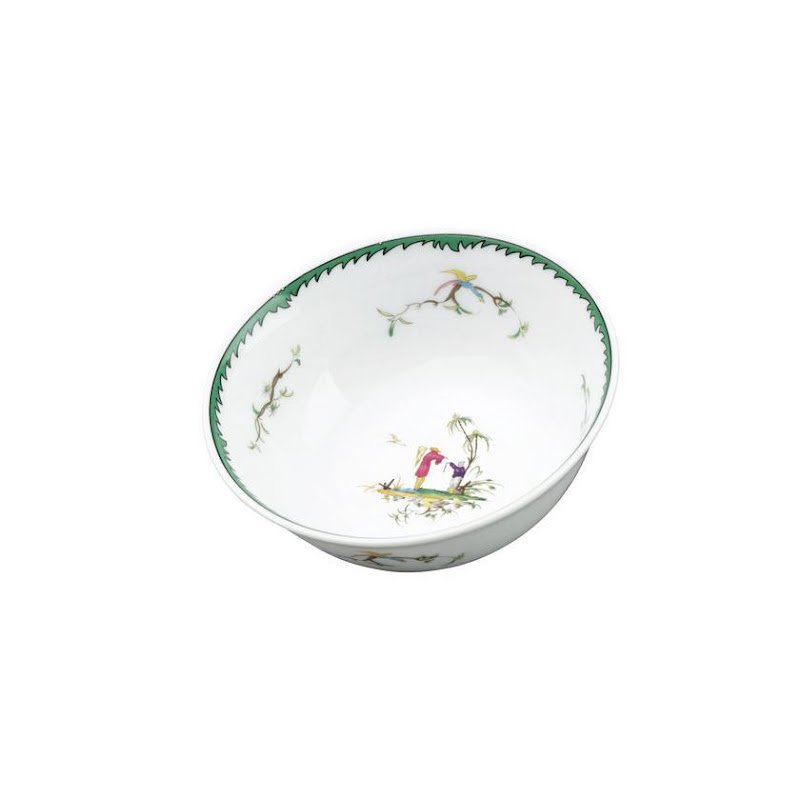 This service features six original pastoral scenes ( see overview ), available on all plates and cups, depicting fishermen in an exotic setting. The rims of the plates are decorated with foliage and birds and an elegant green trim. A perfect combination with "Touraine Double Green Band' is possible if you don't want a decoration on all items