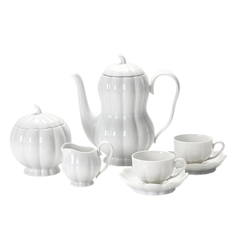 The exoticism of the fruit shapes with the perky handle knob as well as the pleasantly grippy handles, whose softly undulating shape elegantly reflects the softly ribbed walls of the vessels, characterise the charisma of this service.