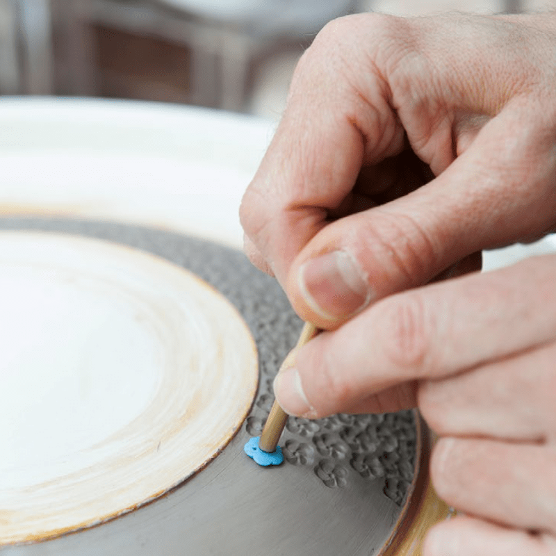 Porcelain with an unglazed (Bisque) rim which beautifully highlights the flower pattern