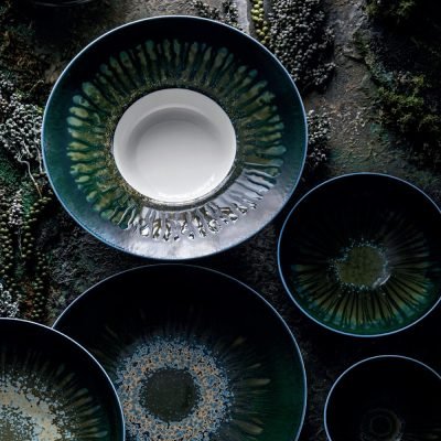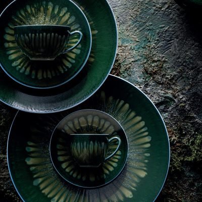 Jaune de Chrome is known world-wide for their exclusive glaze craftsmanship: Metallic components blended with glaze are meticulously applied on porcelain, after which the magic of the firing process transfoms the raw materials. Each piece is unique, neither exactly the same, nor really different.
