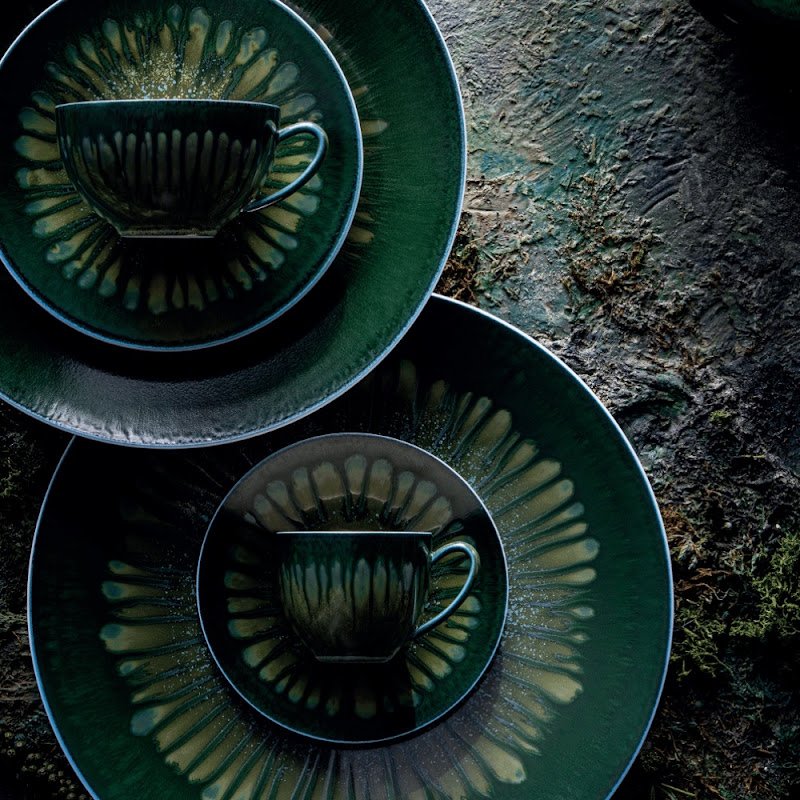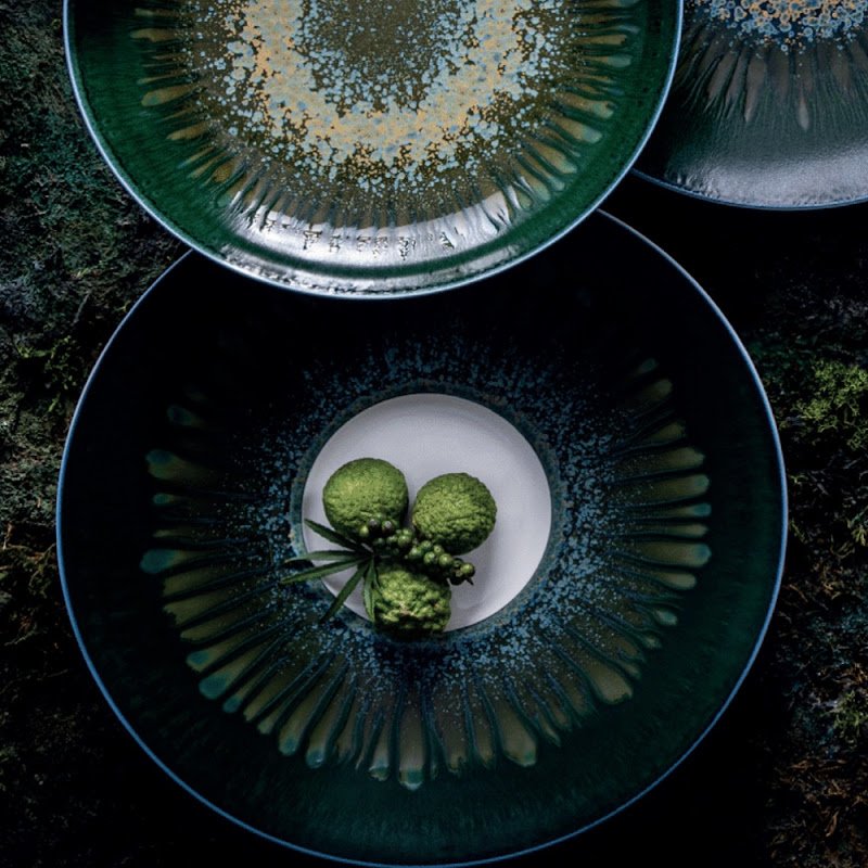 Jaune de Chrome is known world-wide for their exclusive glaze craftsmanship: Metallic components blended with glaze are meticulously applied on porcelain, after which the magic of the firing process transfoms the raw materials. Each piece is unique, neither exactly the same, nor really different.