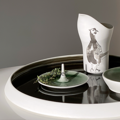 Bisque porcelain, with a mirror that is glazed by hand with a mix of oxid glazes, which makes every single item unique in it's colour