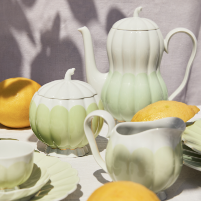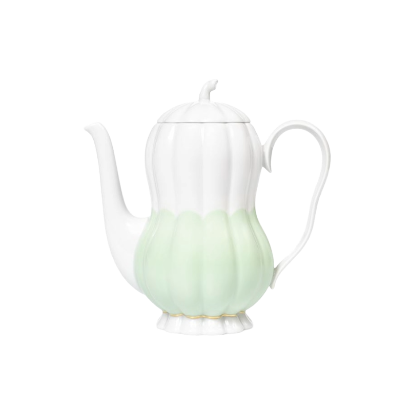 The exoticism of the fruit shapes with the perky handle knob as well as the pleasantly grippy handles, whose softly undulating shape elegantly reflects the softly ribbed walls of the vessels, characterise the charisma of this service.