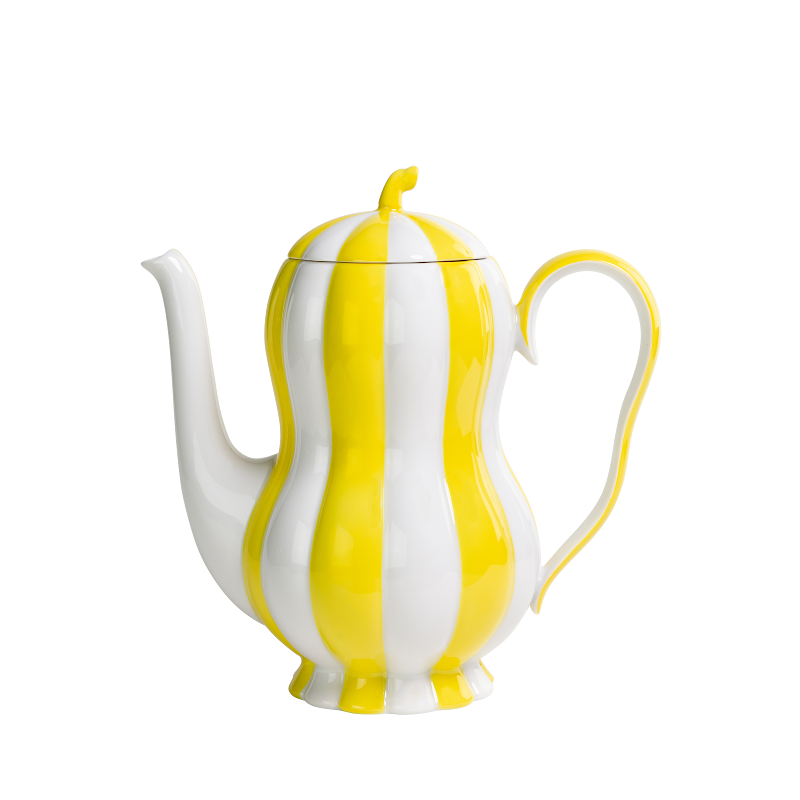The exoticism of the fruit shapes with the perky handle knob as well as the pleasantly grippy handles, whose softly undulating shape elegantly reflects the softly ribbed walls of the vessels, characterise the charisma of this service.