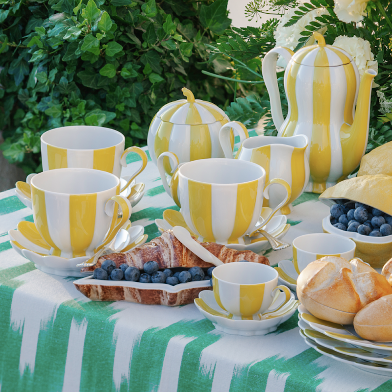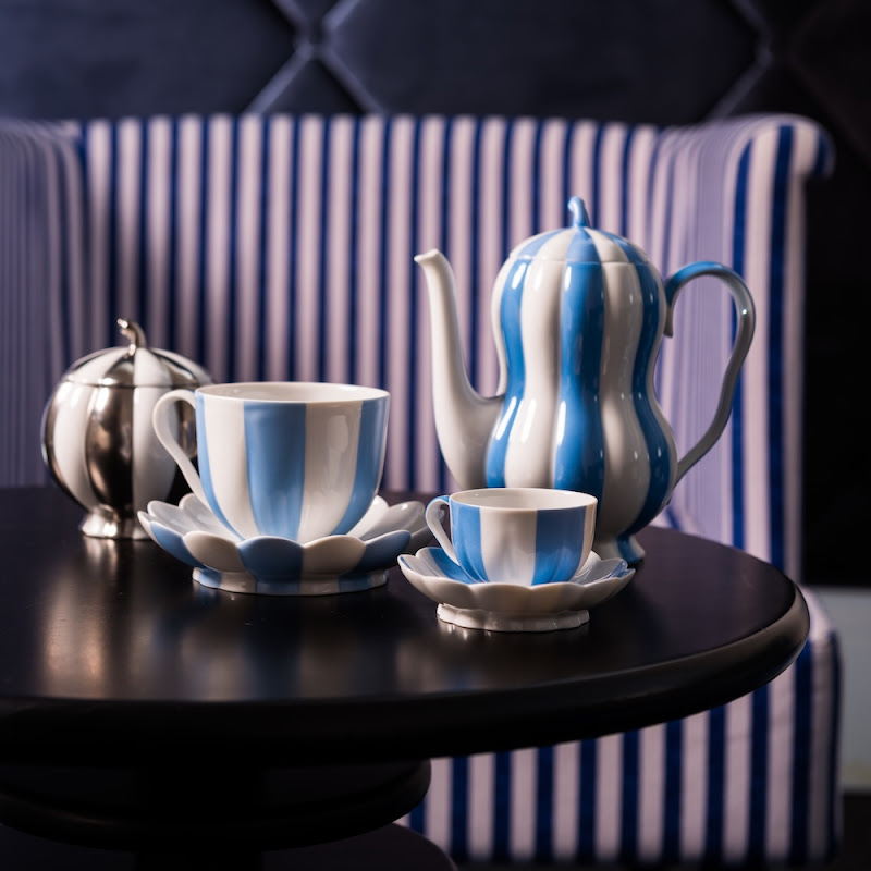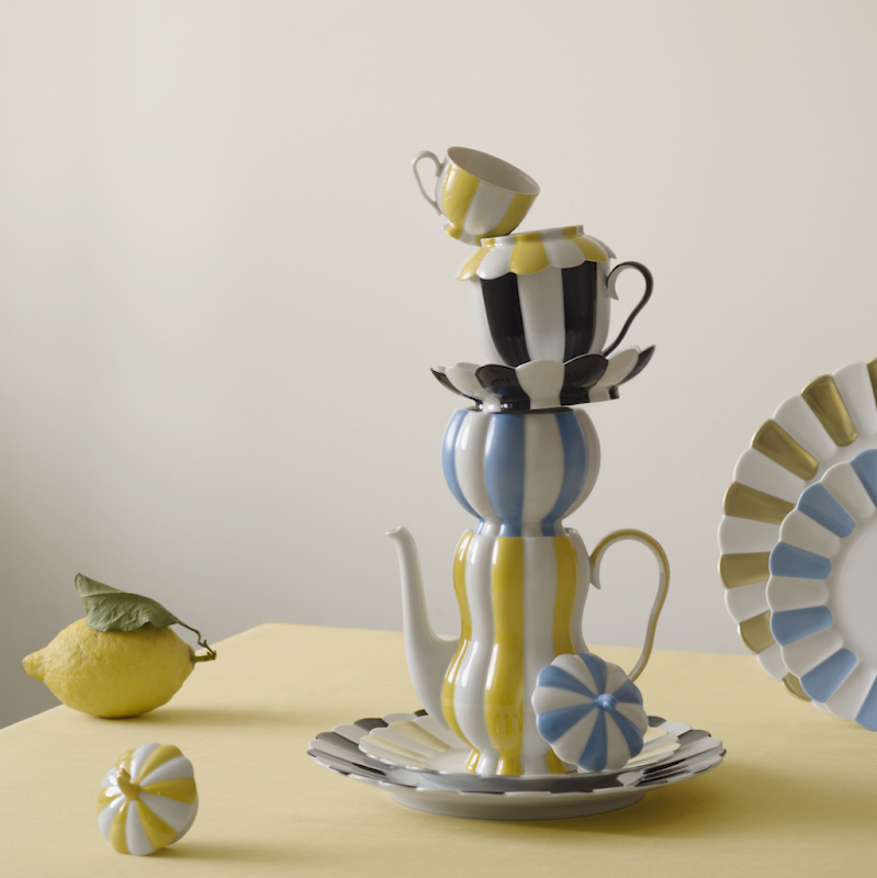 The exoticism of the fruit shapes with the perky handle knob as well as the pleasantly grippy handles, whose softly undulating shape elegantly reflects the softly ribbed walls of the vessels, characterise the charisma of this service.