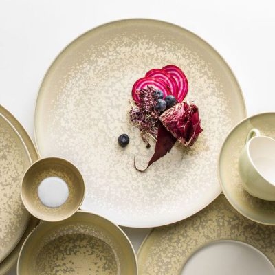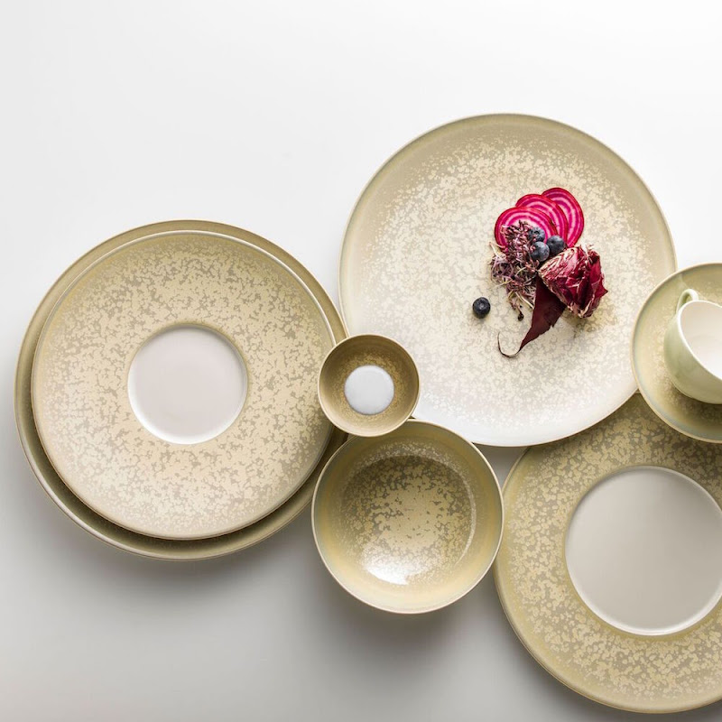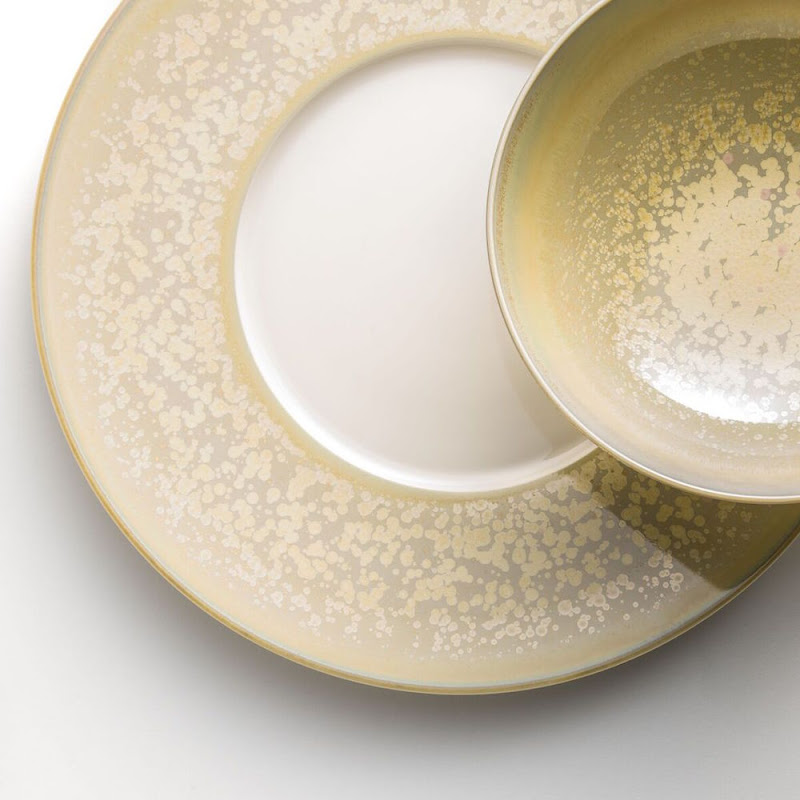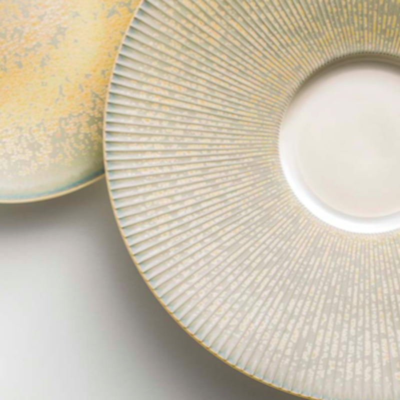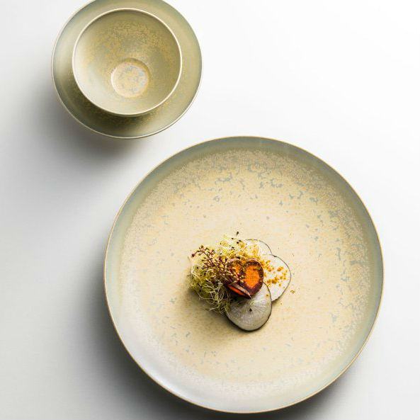 Jaune de Chrome is known world-wide for their exclusive glaze craftsmanship: Metallic components blended with glaze are meticulously applied on porcelain, after which the magic of the firing process transfoms the raw materials. Each piece is unique, neither exactly the same, nor really different.