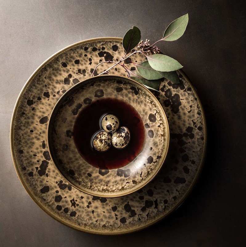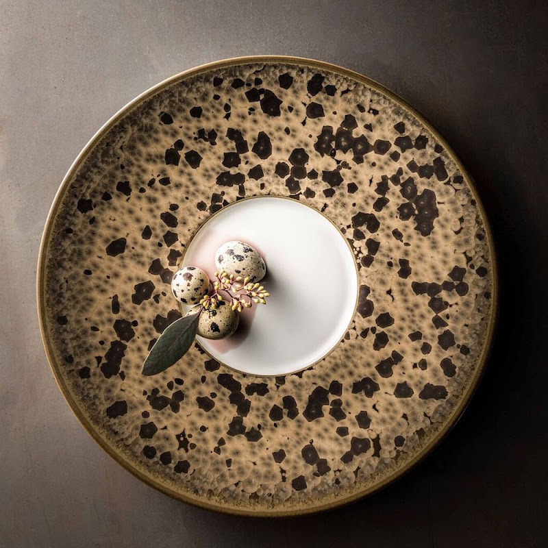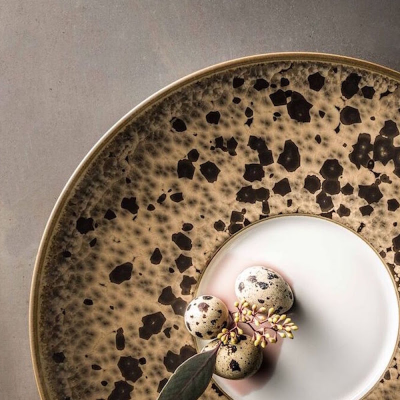 Jaune de Chrome is known world-wide for their exclusive glaze craftsmanship: Metallic components blended with glaze are meticulously applied on porcelain, after which the magic of the firing process transfoms the raw materials. Each piece is unique, neither exactly the same, nor really different.