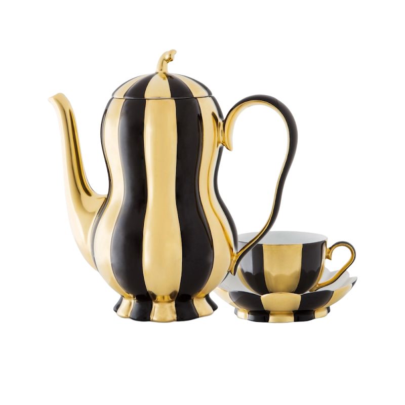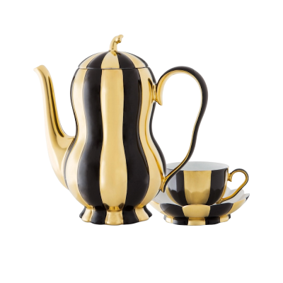 The exoticism of the fruit shapes with the perky handle knob as well as the pleasantly grippy handles, whose softly undulating shape elegantly reflects the softly ribbed walls of the vessels, characterise the charisma of this service.
