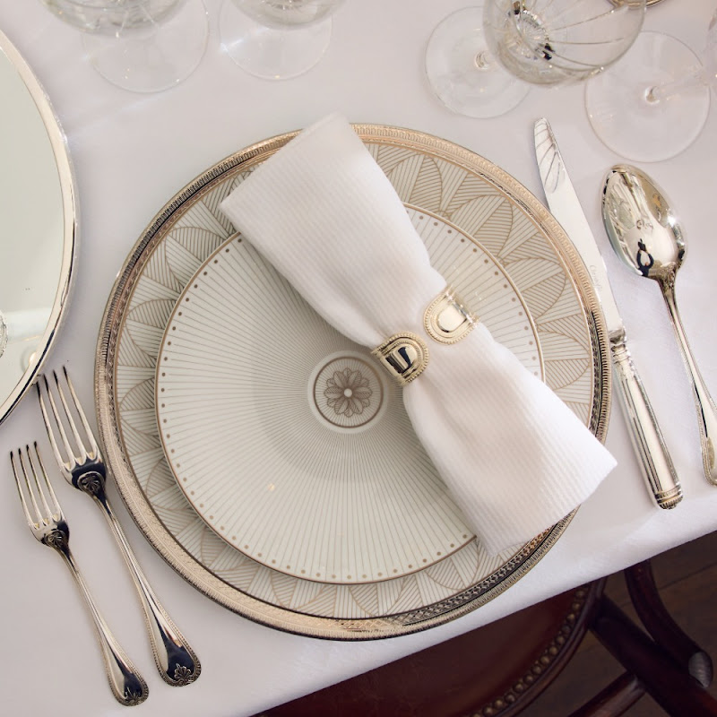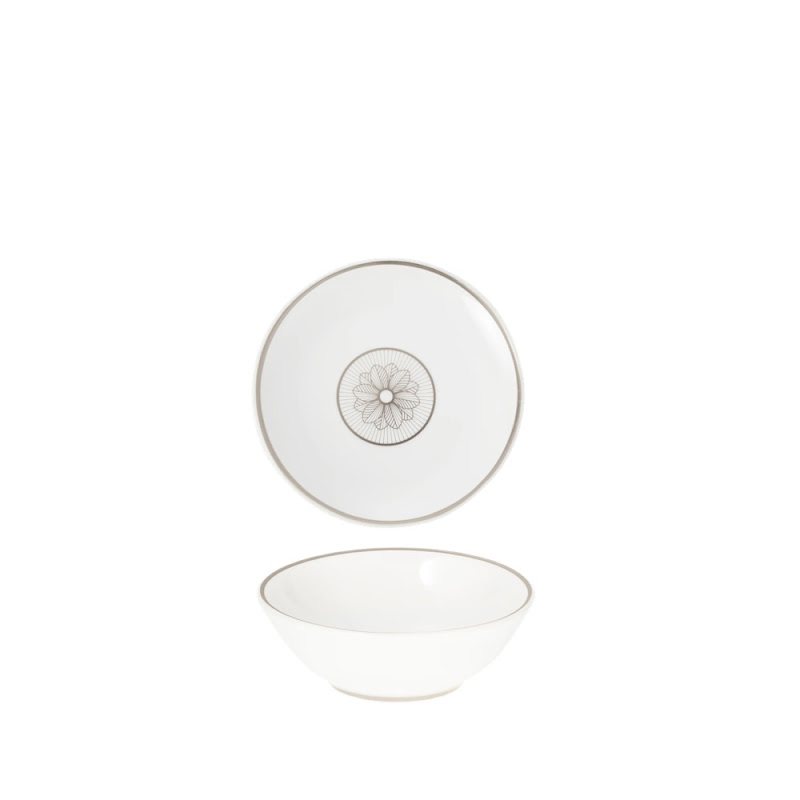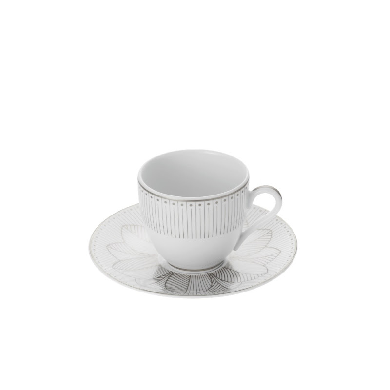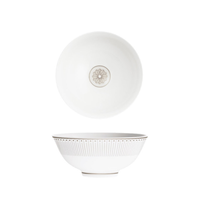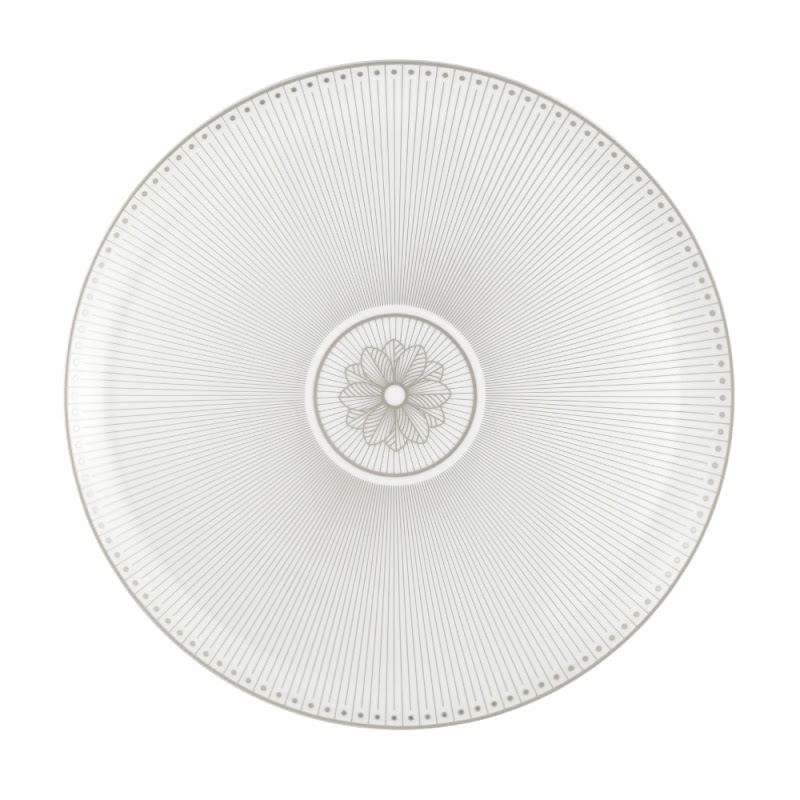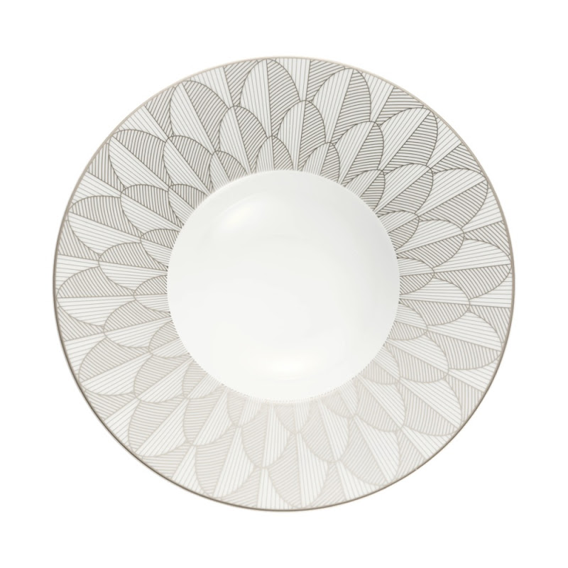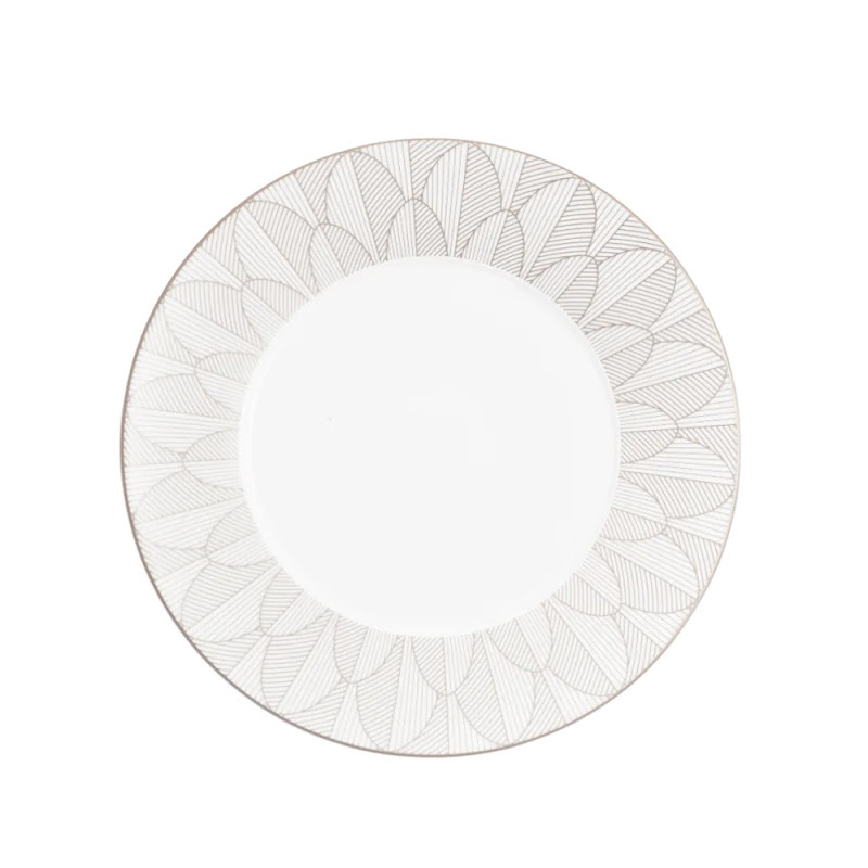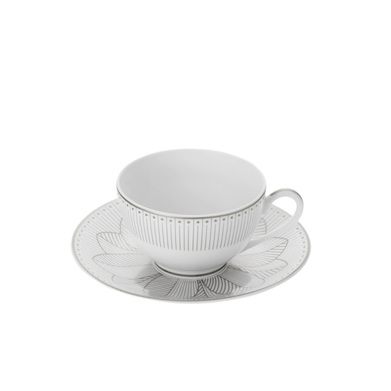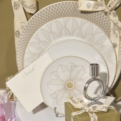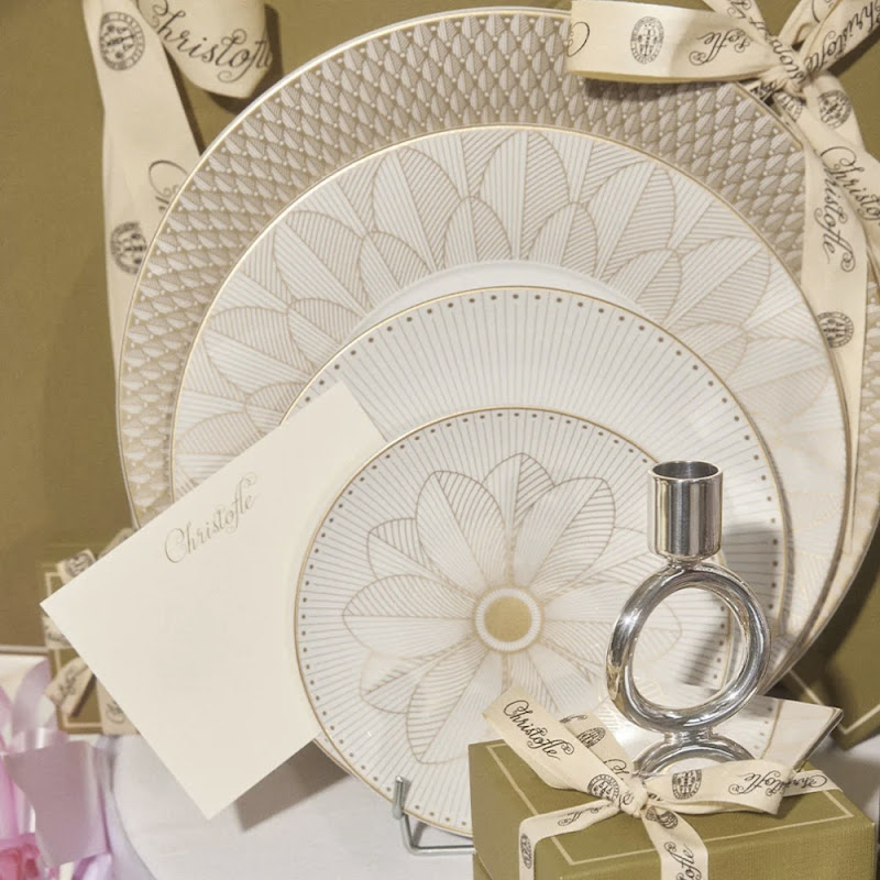 The pattern is inpired by the traditional Malmaison model, but has a modern, contemporary appearance. Each piece has its own decoration and thus allows you to vary your table according to the moments of tasting. Available in platinium and gold.