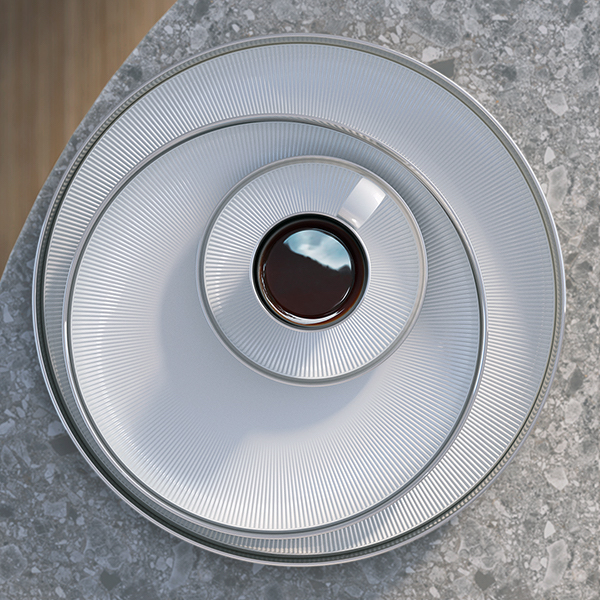 Decorated with filigree structures, inspired by the radiance of a shining star. Available in three designs, white glazed, satin white and white glazed with Platinum rim