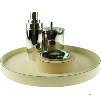 Removable metal ashtray in wooden calfsleather covered base.