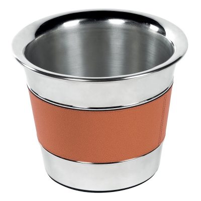 Partially leather covered insulated champagne bucket in chrome-plated steel.