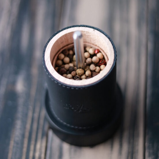 The wooden base is covered with leather, grey for salt and black for pepper